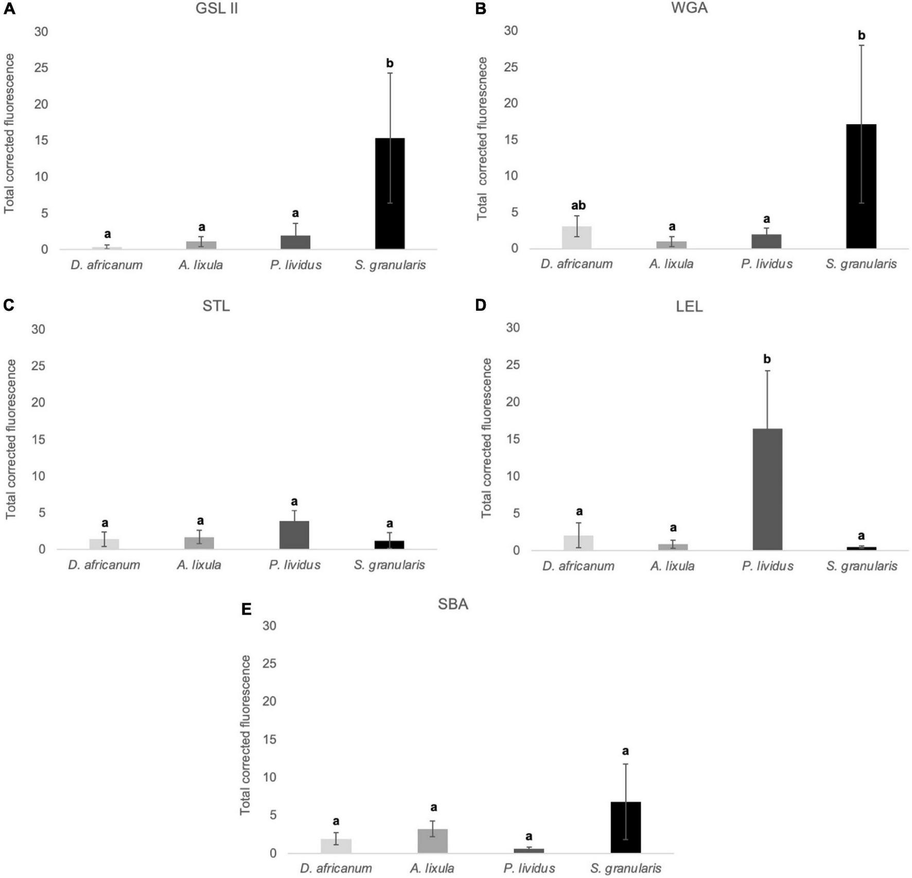 Total corrected fluorescence (TCF) of footprints deposited by the adoral tube feet of Diadema africanum, Arbacia lixula, Paracentrotus lividus and Sphaerechinus granularis, and labelled with GSLII (A), WGA (B), STL (C), LEL (D) and SBA (E). TCF units are arbitrary. Data are expressed as means ± SD in each species. Significant interspecific differences between means for a given lectin are indicated by letters in superscript; means sharing at least one letter are not significantly different (P > 0.05, multiple comparison test of Tukey).