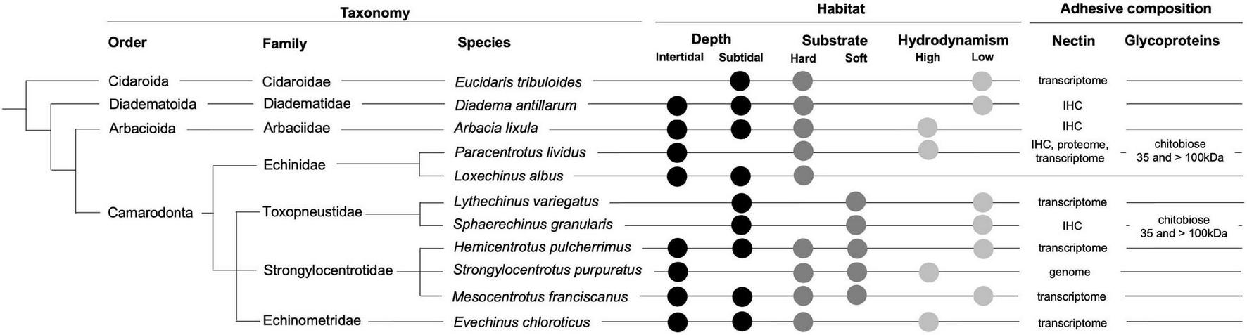 Taxonomy, habitat, and adhesive composition of the analyzed echinoid species. Phylogeny according to Koch and Thompson (2020). Habitat information provided by https://www.sealifebase.ca and http://www.marinespecies.org/echinoidea/. IHC, immunohistochemistry.