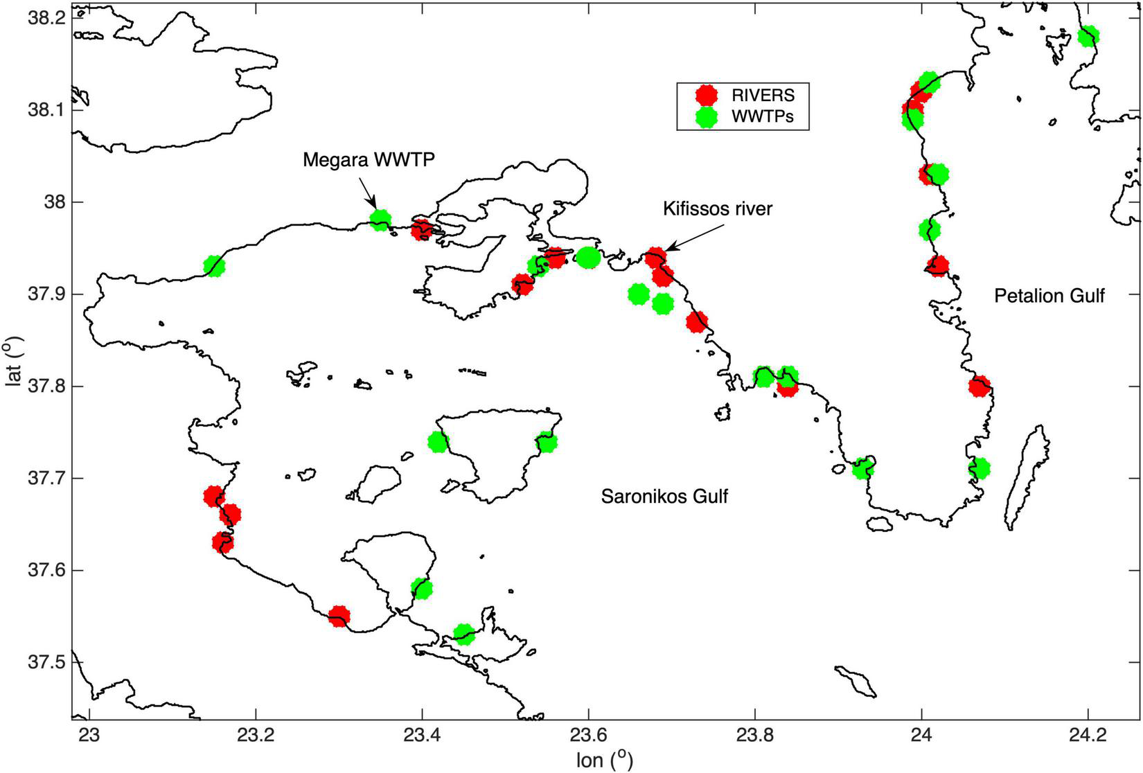 The Saronikos Gulf Area with the Macro and Micro Plastic Point Sources from Rivers and WWTPs.