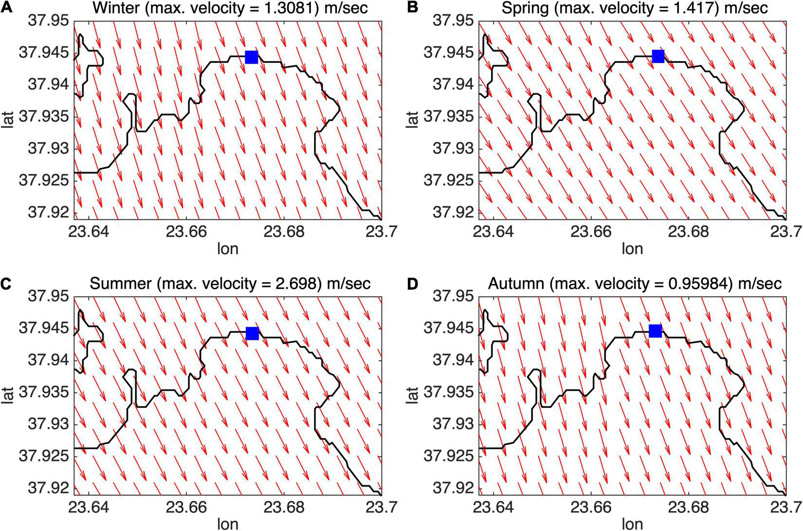 Seasonal [Winter: (A), Spring: (B), Summer: (C), Autumn: (D)] Wind Conditions near the Kifissos River Mouth (denoted by the blue square).