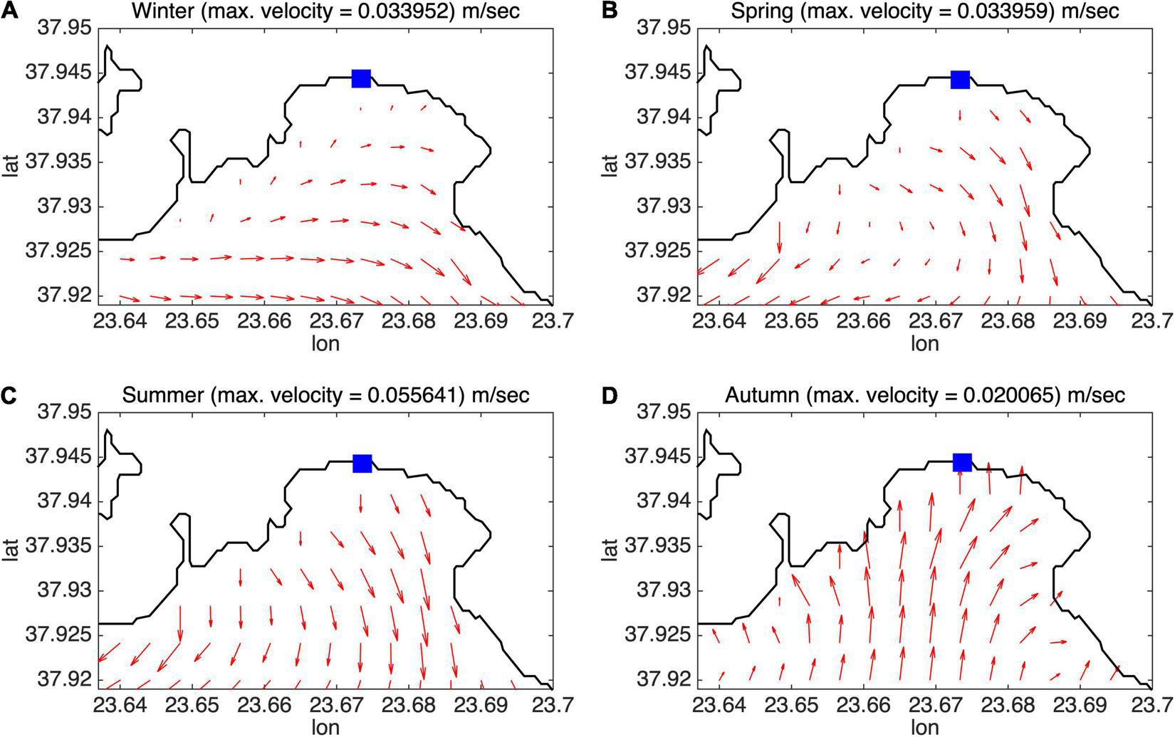 Seasonal [Winter: (A), Spring: (B), Summer: (C), Autumn: (D)] Current Speed and Direction at the Depth of 1 m near the Kifissos River Mouth.