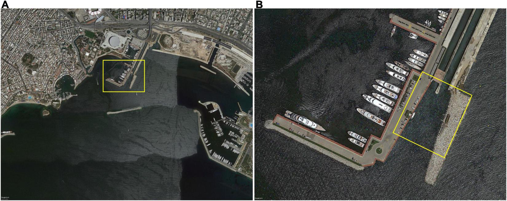 Aerial Snapshots of the Kifissos River Estuary Surrounding Area (A), including the position of the Wave Breaker and the adjacent Marinas and a close up (B) to the River Mouth (Google Earth, 2021).