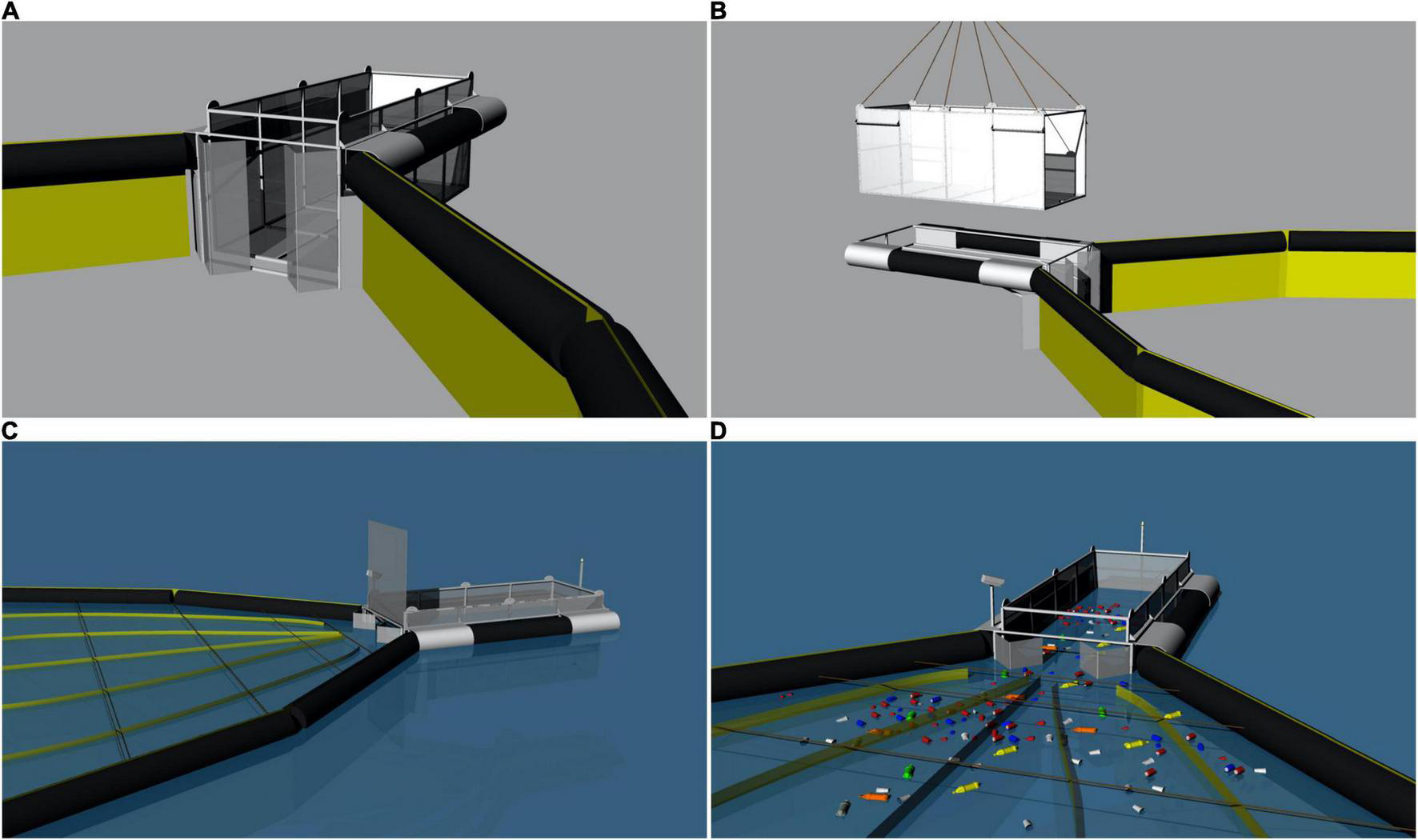 Initial diagram of the System (A), displaying the Cage removal (B) and the positioning of the floating barriers (C) for best litter guidance when adding water flow (D).