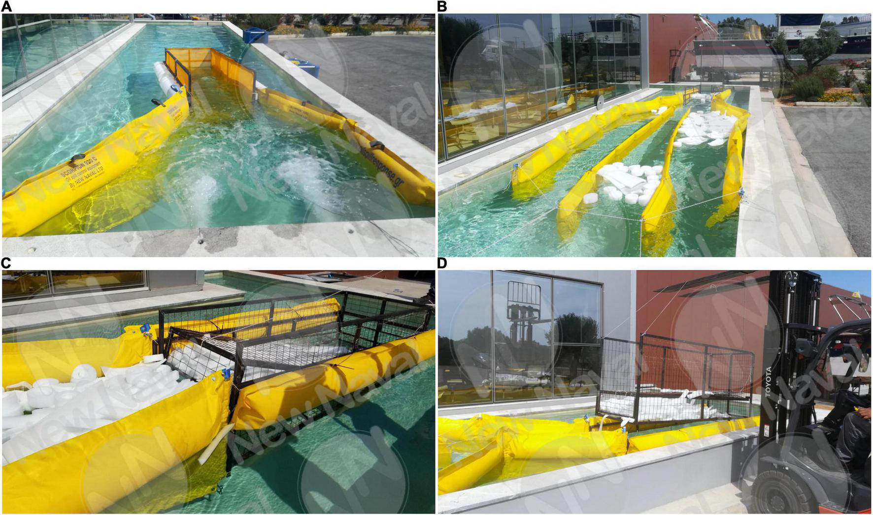 Lab Tests of the 1:2 Scale Prototype with the addition of (A) Water Flow, (B) Floating Barriers and litter, (C,D) removable Cage.