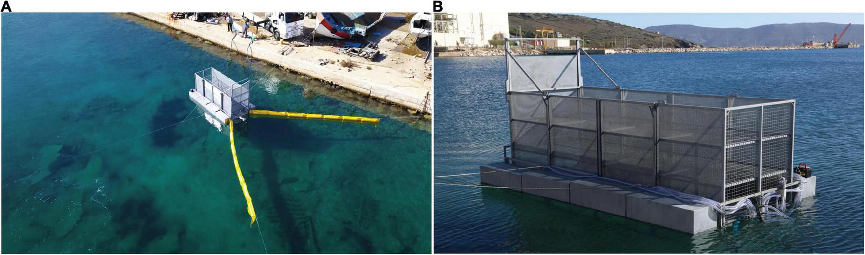 Sea trials including safe anchoring (A) and buoyancy tests (B) of the full scale System.