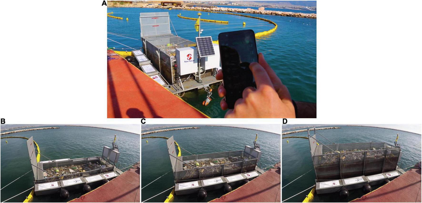 CLEAN TRASH System Test of Remote Monitoring (A) and Switch between System Partitions (B–D), after Installation at the Kifissos River Mouth.