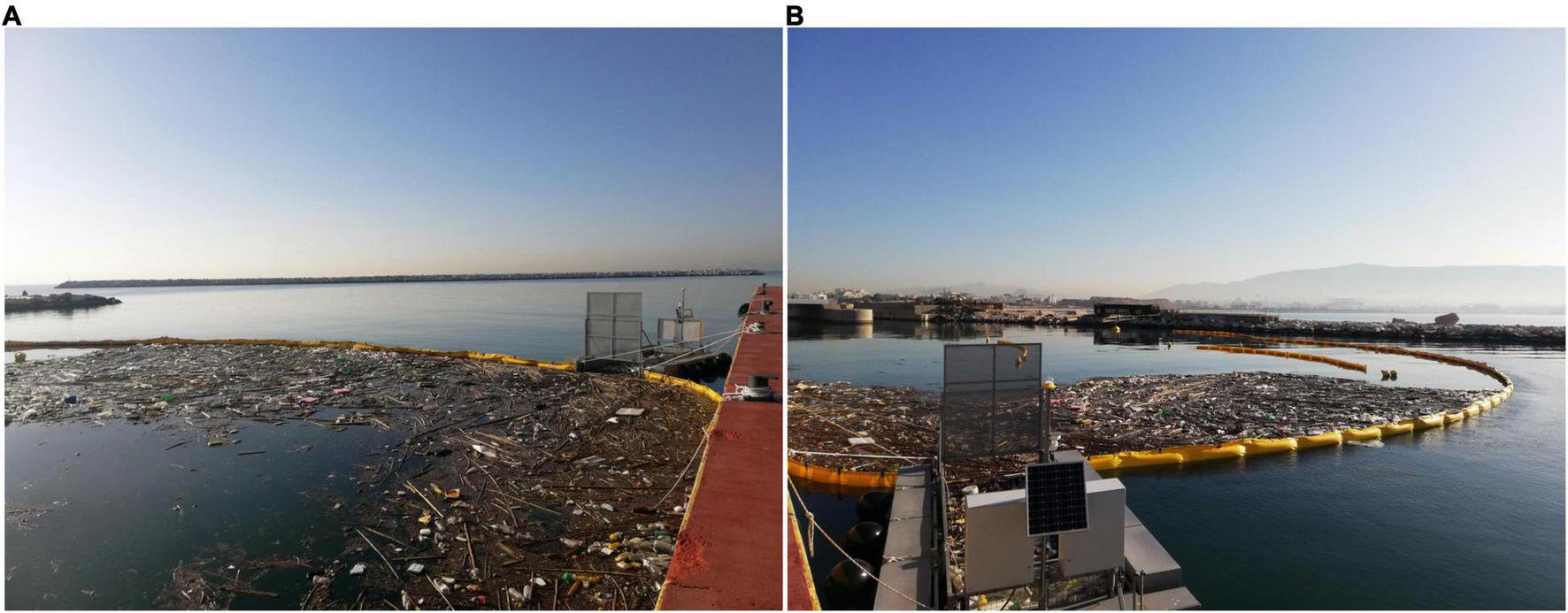 Trash Collected by the CLEAN TRASH System after a Major Flooding Event, as opposed to the Clean Sea Area (A) and the Clean River Estuary (B) in the Background.