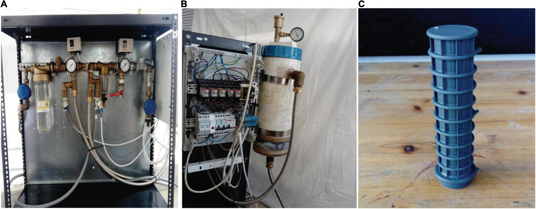 The lab scale prototype (A) and the PVC filter vessel (B) and a 3D nozzle fabricated for sand particles retention (C).