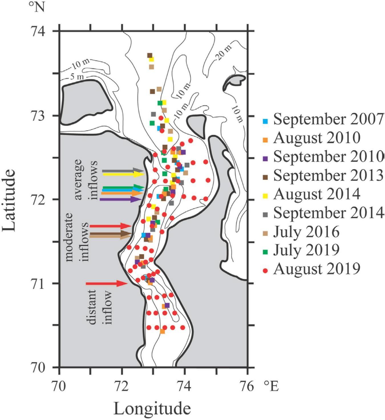 Figure 2. Hydrographic stations of 10 oceanographic field surveys conducted in the Gulf of Ob in 2007–2019 (circles for the two surveys in August 2019, squares for all other cruises). Arrows indicate southernmost detected locations of the isohaline of five in the bottom layer of the Gulf of Ob. Note that the two surveys in August 2019 are indicated by two red arrows.