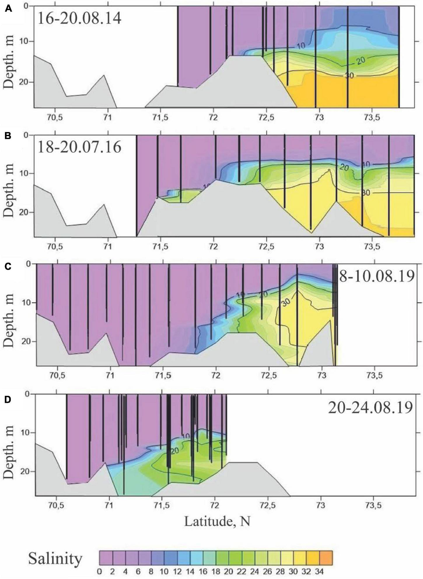 Figure 4. Salinity structure along the transect in the Gulf of Ob on August 16–20, 2014 (A), July 18–20, 2016 (B), August 8–10, 2019 (C), and August 20–24, 2019 (D). Black vertical lines represent salinity measurements at the hydrographic stations.