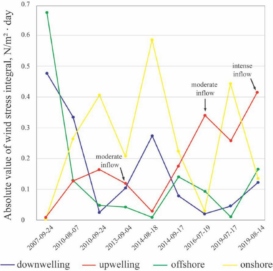 Figure 7. The absolute values of time integrals of downwelling (blue), upwelling (red), offshore (green), and onshore (yellow) wind stress at the central part of the Kara Sea preceding the periods of in situ measurements. Black arrows indicate cases with moderate and intense inflows.