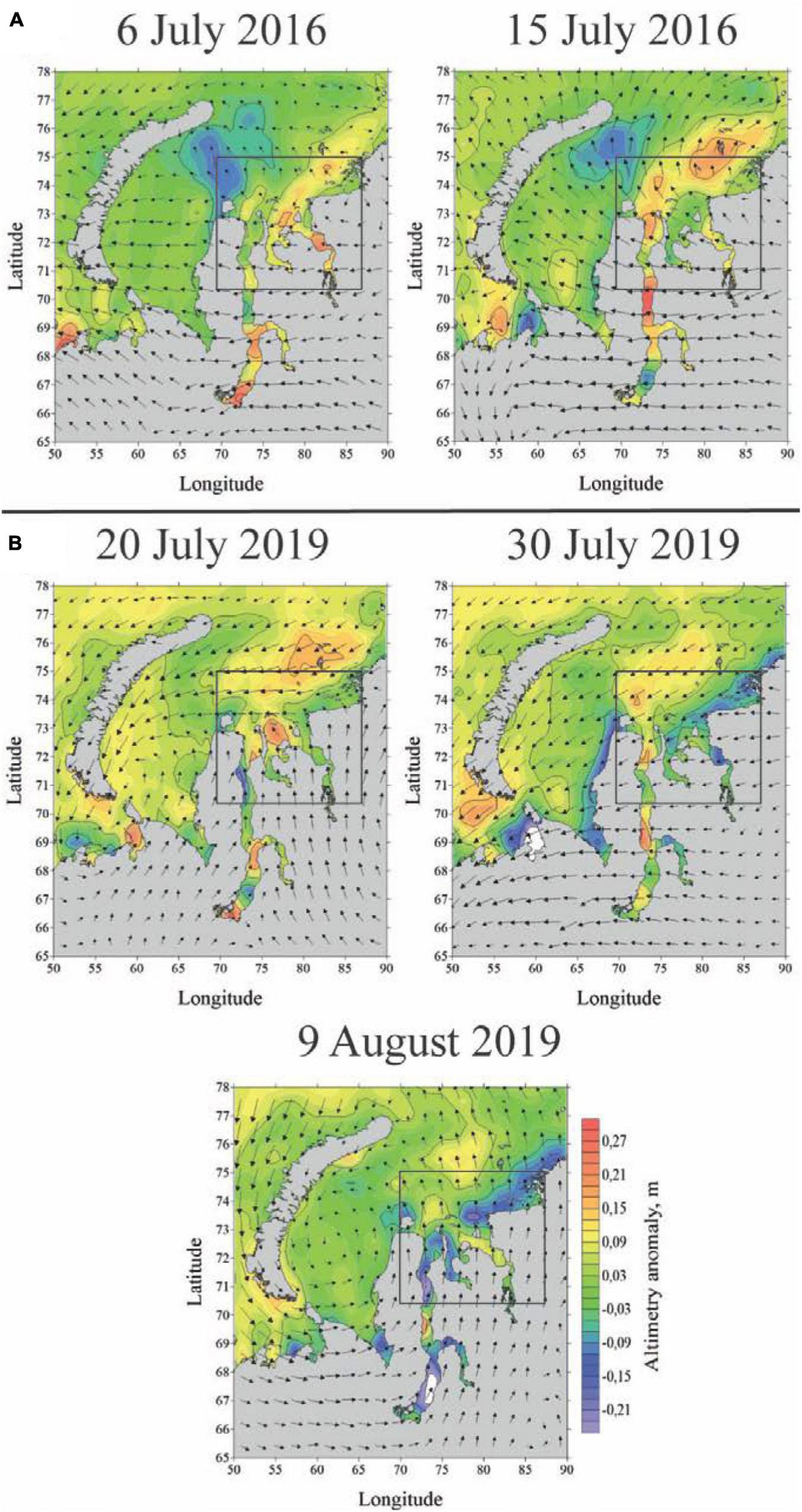 Figure 8. AVISO satellite altimetry anomaly in the Kara Sea on July 6 and July 15, 2016 (A), on July 20, July 30, and August 9, 2019 (B). Black arrows indicate wind direction. Black rectangles indicate the location of area as shown in Figure 9.
