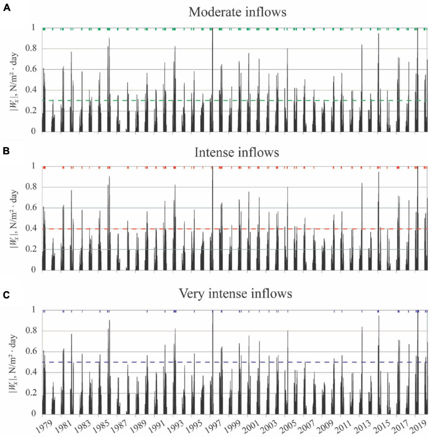Figure 10. Absolute value of upwelling wind stress integral in the central part of the Kara Sea calculated from the ERA5 atmospheric reanalysis, indicating periods of upwelling-induced moderate inflows (green bars) (A), intense inflows (red bars) (B), and very intense inflows (blue bars) (C) to the Gulf of Ob during ice-free seasons (July to October) in 1979–2020. Note that these estimations are based on wind data and not based on in situ measurements.