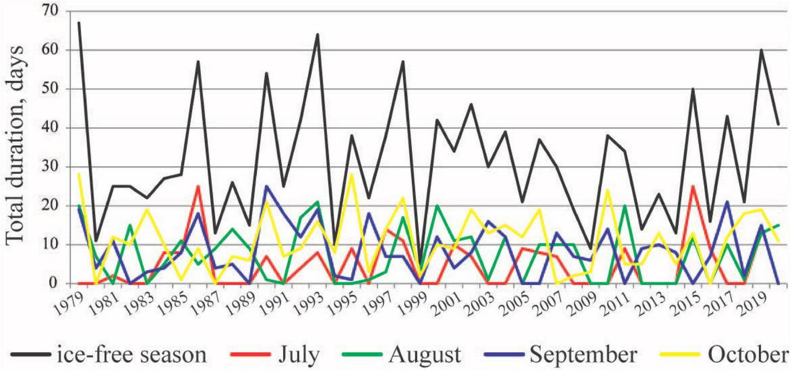 Figure 11. Total annual durations of upwelling-induced distant inflow periods calculated from the ERA5 atmospheric reanalysis during July (red line), August (green line), September (blue line), October (yellow line), and during the whole ice-free season (black line) in 1979–2020. Note that these estimations are based on wind data and not based on in situ measurements.