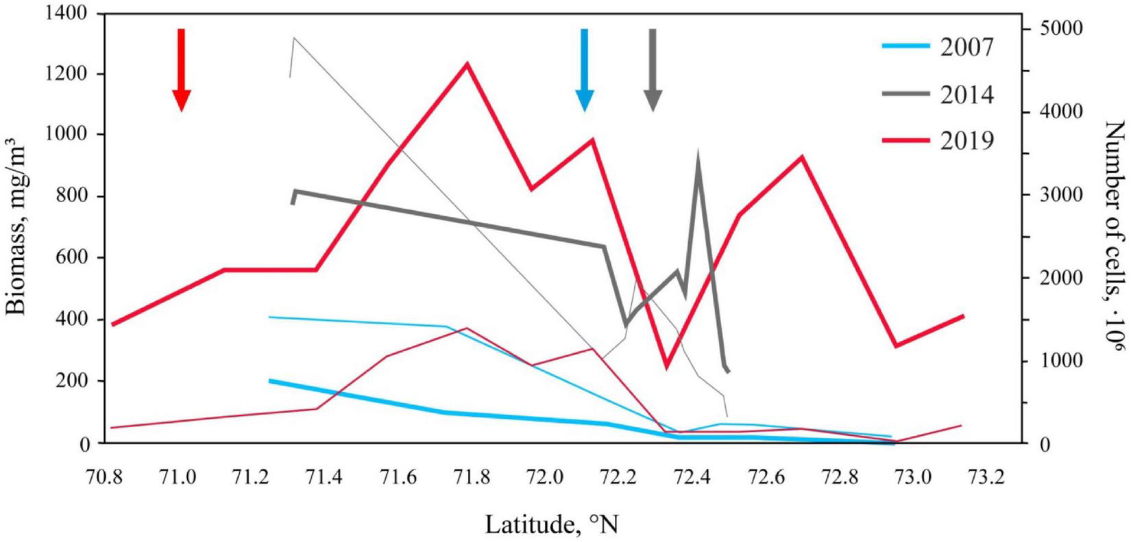 Figure 12. Phytoplankton biomass (thick lines) and the number of cells (thin lines) in 2007 (blue), 2014 (gray), and 2019 (red). Arrows indicate southernmost detected locations of the isohaline of five in the bottom layer in the Gulf of Ob.