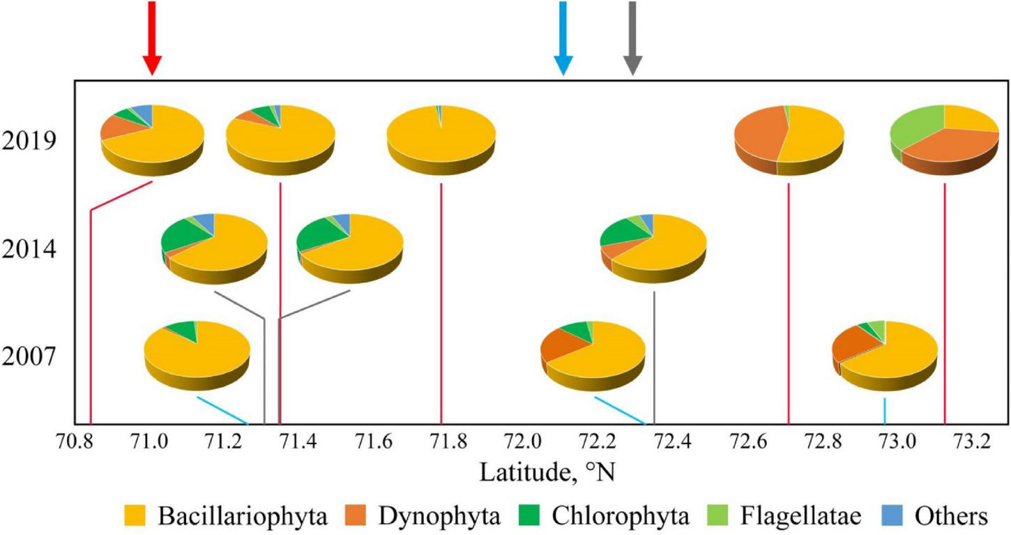 Figure 13. Taxonomical structure of phytoplankton communities in 2007 (blue), 2014 (gray), and 2019 (red) at different zones within the Gulf of Ob. Arrows indicate southernmost detected locations of the isohaline of five in the bottom layer of the Gulf of Ob.