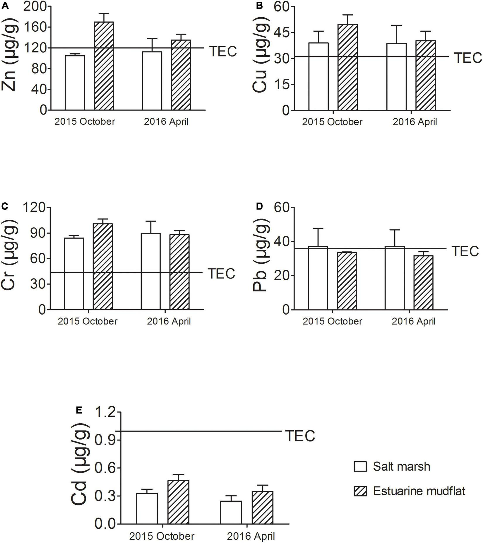 Concentrations of heavy metals (A) Zn, (B) Cu, (C) Cr, (D) Pb, and (E) Cd in the intertidal sediments from estuarine mudflats (WSK, SDK, and LHK) and Chongming salt marshes (BBY and DWS) collected during October 2015 and April 2016 at the Yangtze River estuary. The threshold effect concentrations (TEC) of respective heavy metals are indicated (MacDonald et al., 2000).