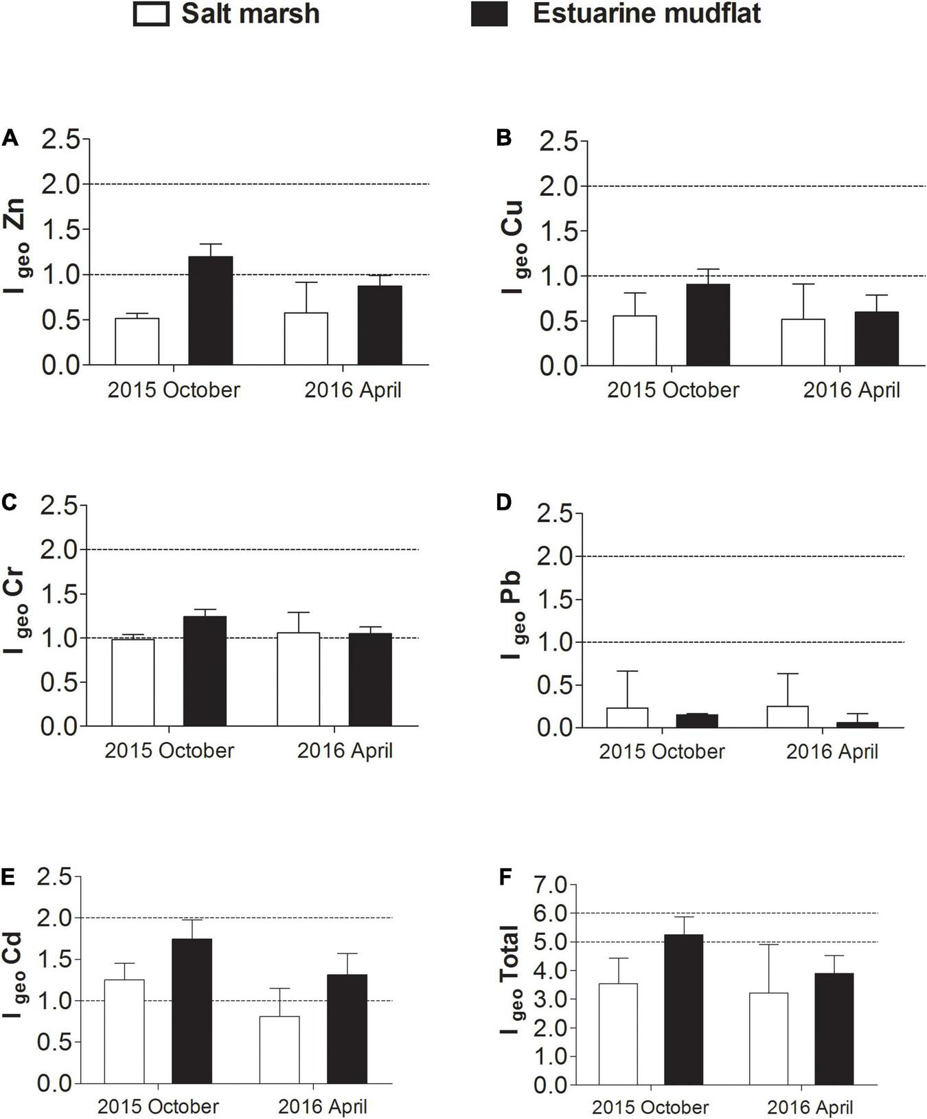 The geo-accumulation indices (Igeo) of heavy metals in the sediment samples are summarized in Figure 3. In October 2015, Zn, Cr and Cd were recorded at moderate levels in estuarine mudflat sediments; in the Chongming salt marsh sediments, only Cd was recorded at a moderate level, with Cr being very close to the moderate level at an Igeo of 0.985. In April 2016, Igeo values for Zn and Cd were classified as weakly polluted in estuarine mudflats following the decrease in Zn and Cd concentrations measured. In contrast, the IgeoCr results for salt marsh sediments showed increase and was classified as moderately polluted. While Cd concentrations recorded were below the established TEC levels for all sites consistently over two periods of time, IgeoCd suggested that the studied sediments in estuarine areas could be considered moderately polluted by Cd. Based on the Igeo of the five heavy metals studied, the cumulative Igeo total of heavy metals in the estuarine mudflat and salt marsh sediments was calculated to provide an overview of total heavy metal pollution. In 2015, at an Igeo total of 5.25 and 3.544 for estuarine mudflat and salt marsh sediments, respectively, the estuarine mudflats can be considered moderately polluted by heavy metals, while the Chongming salt marsh sediments were weakly polluted by heavy metals. In 2016 April, both salt marsh and estuarine mudflat sediments were considered weakly polluted by total heavy metals (Igeo total of 3.216 and 3.894).
