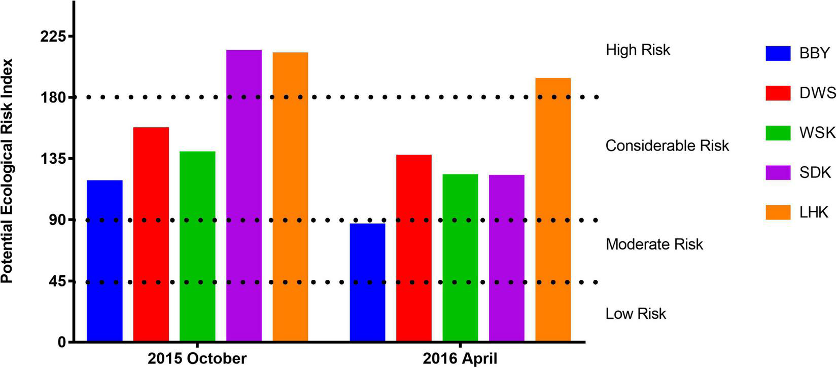 The potential ecological risk indices (RI) and risk levels of heavy metals at different sampling sites are summarized in Figure 4. As shown in Table 2, Cr, Cu, Pb, and Zn had relatively low toxicity coefficients and hence relatively low ecological risk factor contributed toward the corrected RI. The observation was consistent across all sampling sites. In contrast, the ecological risk factors for Cd were much higher for its high toxicity, ranging from considerable risk in salt marsh sites (BBY and DWS) to high risk in the estuarine mudflat sites (SDK and LHK). The presence of Cd at high concentrations above background across all sites primarily contributed to the RI and risk levels recorded, defined as the total of the potential ecological risk factors of individual heavy metals considered. As a result, almost all studied sample sites could be considered consistently exposed to at least considerable levels of ecological risk from heavy metals from October 2015 to April 2016.
