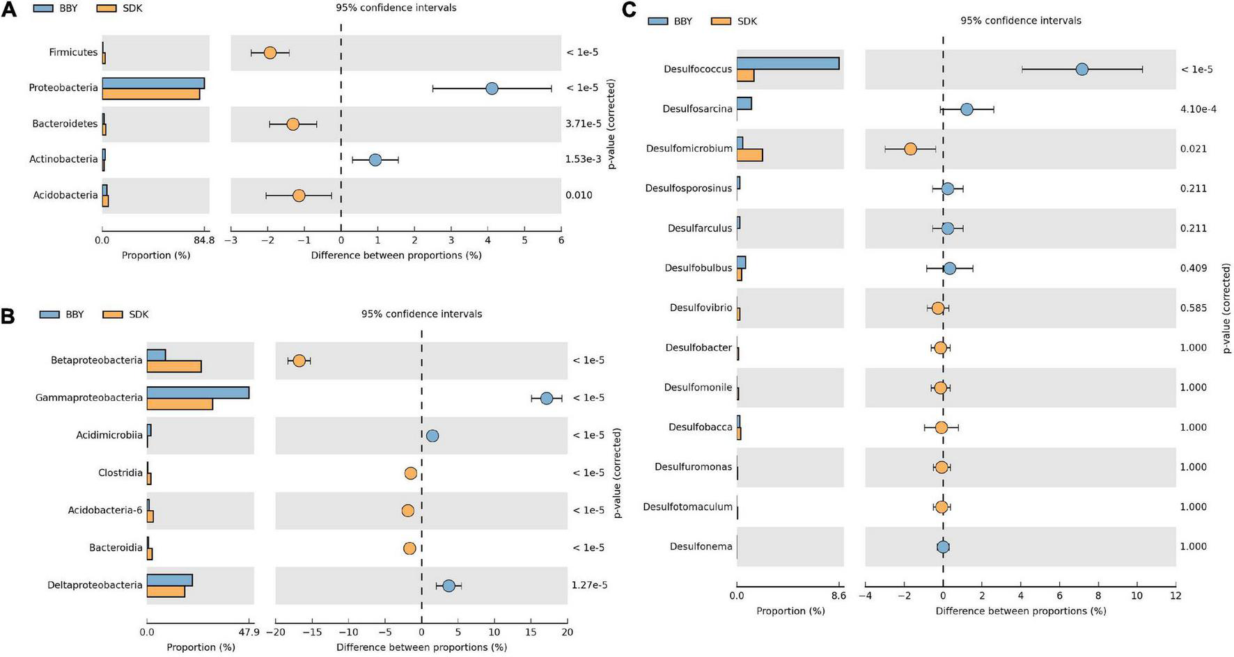 The difference in proportions of recorded bacterial OTUs classified by dominant (A) phyla, (B) classes, and (C) sulfur-reducing bacteria in sediment samples from representative estuarine mudflat (SDK) and the Chongming salt marsh (BBY) sites, collected in October 2015. Significant difference between proportions were analyzed using Welch’s t-test.