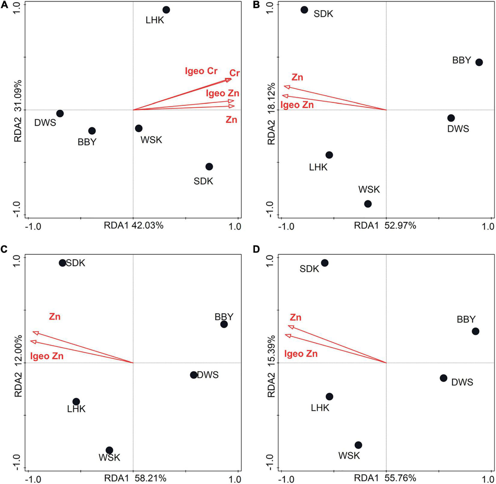RDA ordination plots of the composition and abundances of dominant bacterial (A) phyla, (B) classes, (C) orders, and (D) families from sediment samples collected in October 2015 in relation to heavy metals and their Igeo indices.