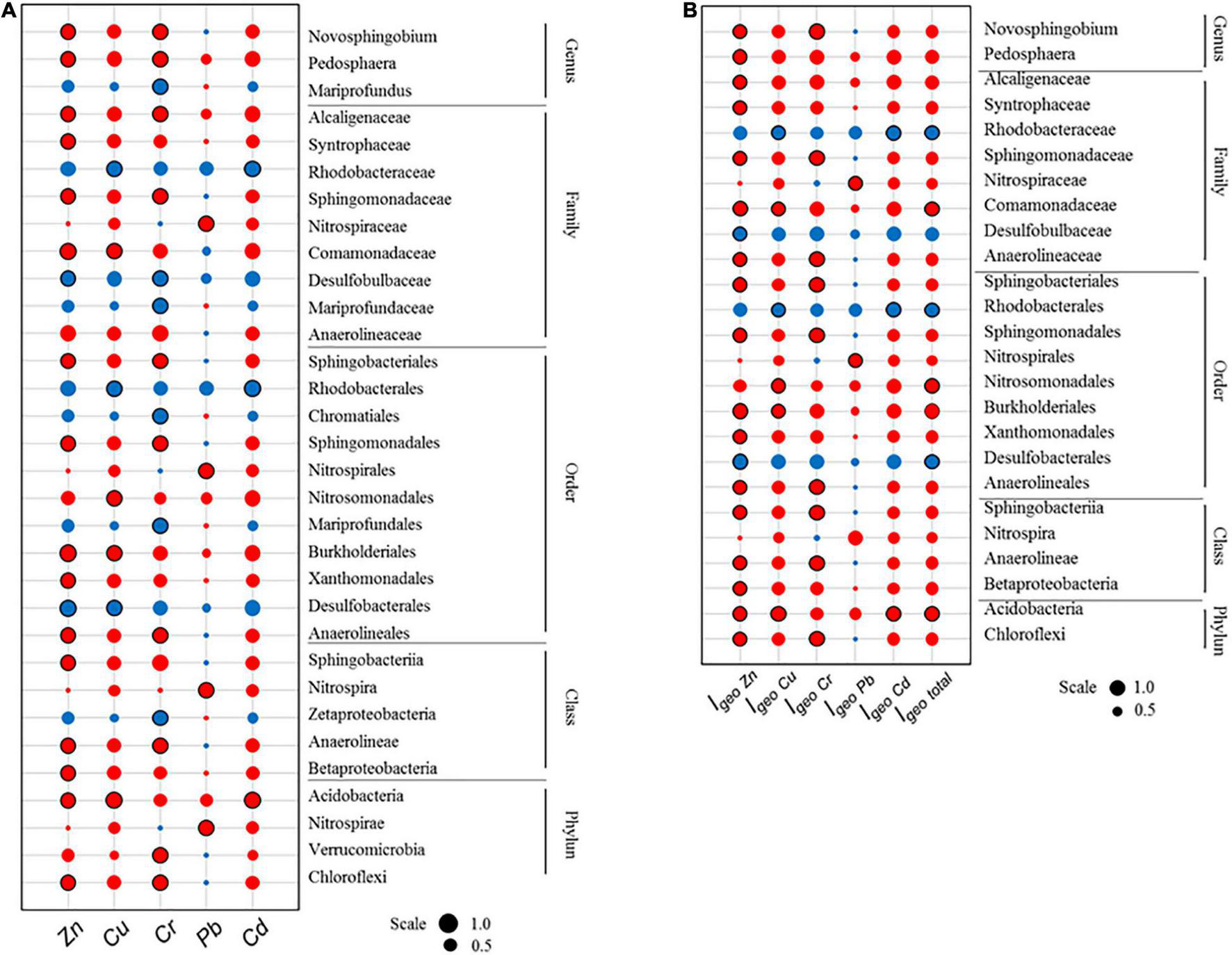 Spearman’s correlation between (A) heavy metal concentration or (B) heavy metal Igeo index and relative abundances of dominant bacterial taxa in microbial communities from sediment samples collected in October 2015. Red and blue colors indicate positive and negative correlations, respectively. Scale represents the numeric data of Spearman coefficients. Significant correlations (P < 0.05) are indicated by a black circular border.