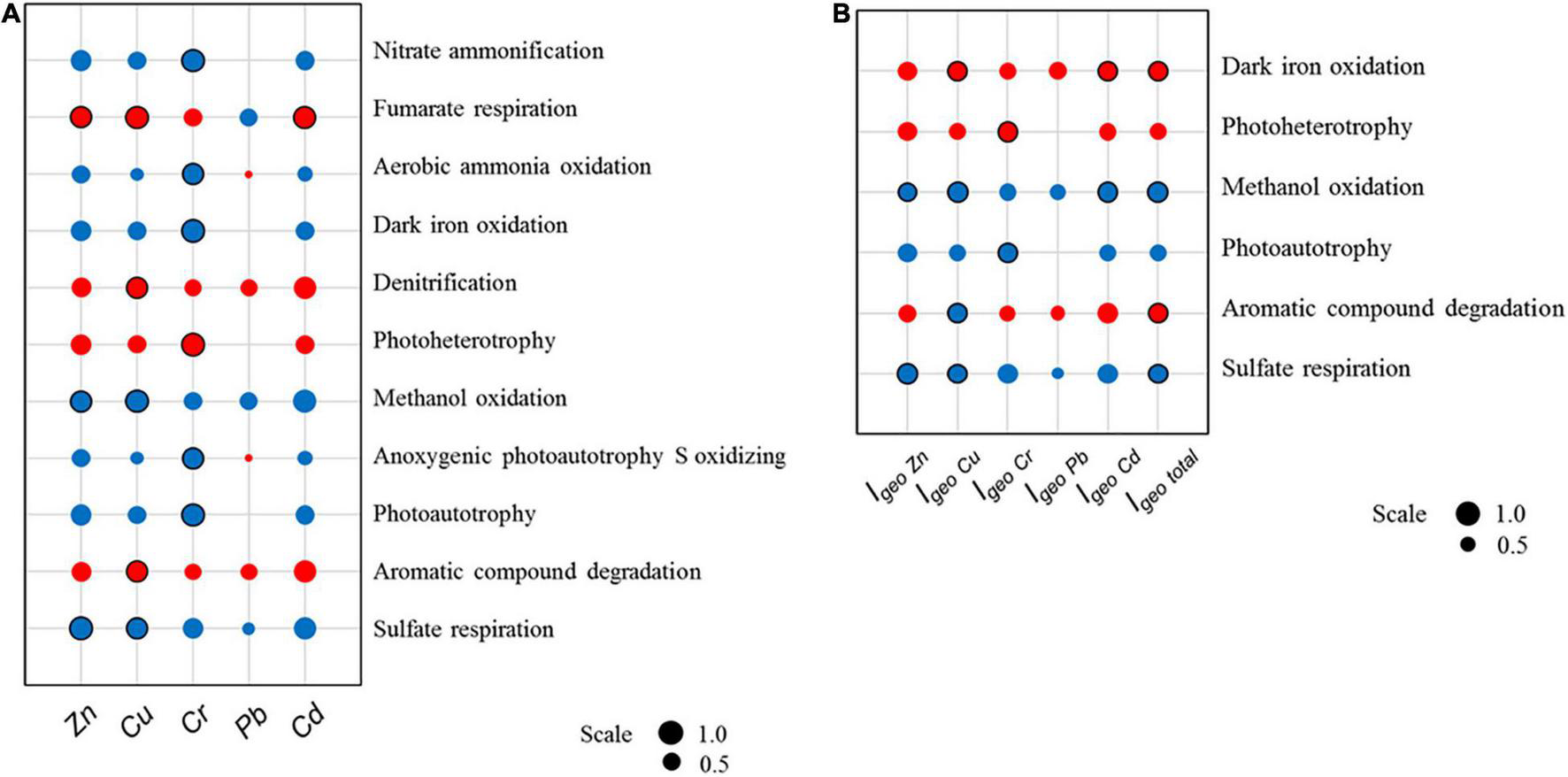 Spearman’s correlations between (A) heavy metal concentrations or (B) heavy metal Igeo indices and relative contributions toward ecological functions by microbial communities from sediment samples collected in October 2015. Red and blue colors indicate positive and negative correlations, respectively. Scale represents the numeric data of Spearman’s coefficients. Significant correlations (P < 0.05) are indicated by a black circular border.