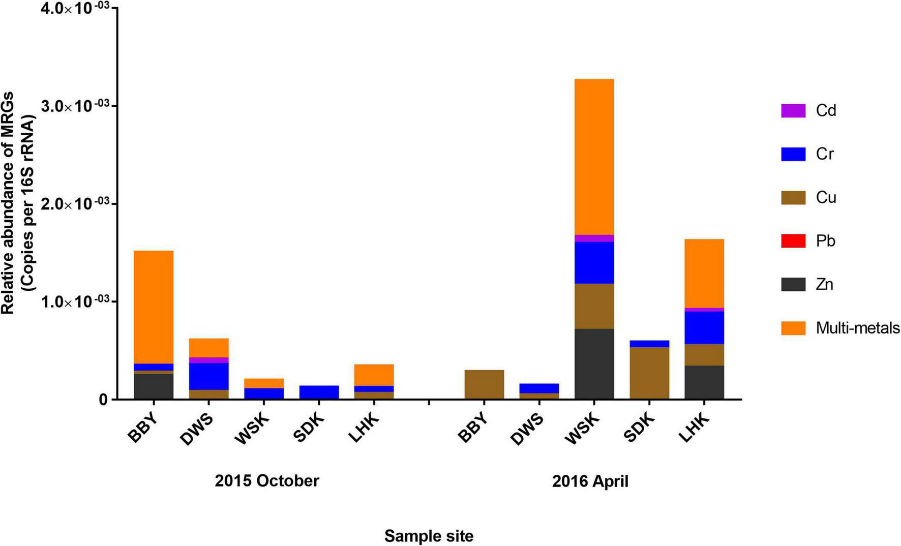 The relative abundance of MRGs corresponding to studied metals (Cd, Cr, Cu, Pb, and Zn) in microbial communities were calculated and summarized in Figure 9. Results showed that, out of the five studied heavy metals, Cu and Cr resistance genes were common among most study sites in Yangtze River estuary. Cd resistance genes were rare and only recorded in three samples at 3.69–5.53 × 10–5 copies per 16S rRNA. There are no records of Pb resistance genes. Overall, bacterial communities from the salt marshes sites (DWS and BBY) displayed a higher diversity and relative abundance in MRG types harbored for the October 2015 samples, while the opposite was recorded for April 2016.