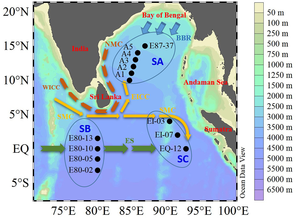 Sampling map and schematic diagram of the primary current regimes in the eastern Indian Ocean (EIO) in October and November 2020. Map created using Ocean Data View. The current systems included are the Bay of Bengal Runoffs (BBR), Northeast Monsoon Current (NMC), West Indian Coastal Current (WICC), East Indian Coastal Current (EICC), and Equatorial Streams (ES) (see Wei et al., 2019a; Guo et al., 2021). Stations A1, A2, A3, A4, A5, and E87-37 were defined as the SA area. Stations E80-02, E80-05, E80-10, and E80-13 were defined as the SB area. Stations EI-03, EI-07, and EQ-12 were defined as the SC area.