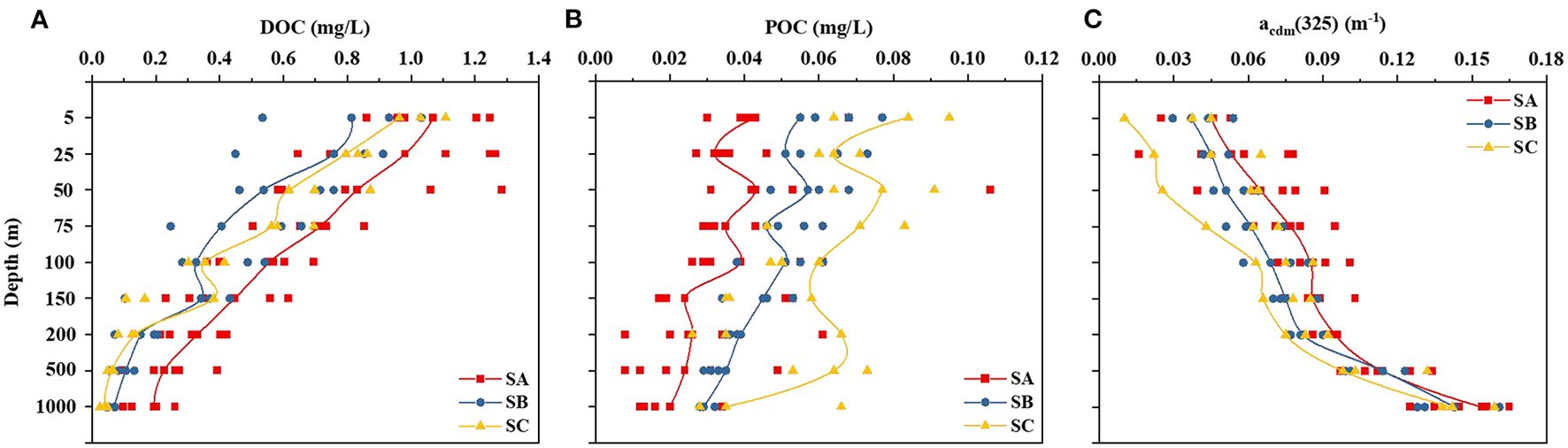 Variation in DOC and POC concentrations and the abundance of CDOM [acdm(325)] at various depths (5–1,000 m) in the three subregions. The red, blue, and yellow lines represented the SA, SB, and SC areas, respectively. DOC, dissolved organic carbon; POC, particulate organic carbon; CDOM, chromophoric DOM; acdm(325), an abundance of chromophoric dissolved organic matter.