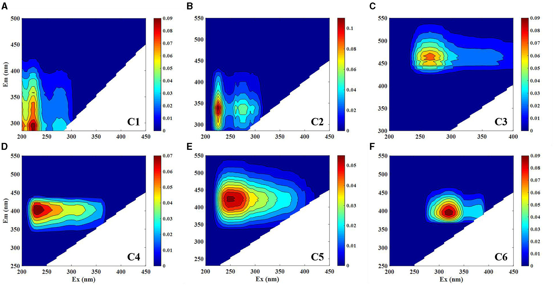 Excitation emission matrix (EEM) contour plots of the six fluorescence components identified by the parallel factor analysis (PARAFAC) model. C1–C6 represented components 1 to 6, respectively. The fluorescence intensity is given in Raman units (RU) with different scales.