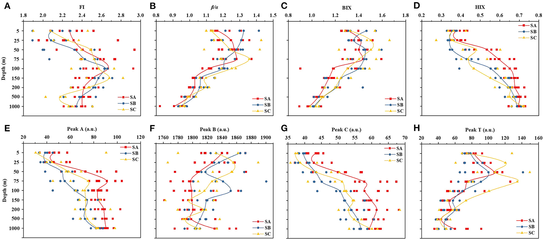 Variation in fluorescence indices (FI, BIX, β/α, and HIX) and peaks (peaks A, B, C, and T) at various depths (5–1,000 m) in the three subregions. The red, blue, and yellow lines represented the SA, SB, and SC areas, respectively. FI, fluorescence index; BIX, biological index; β/α, freshness index; HIX, humification index.