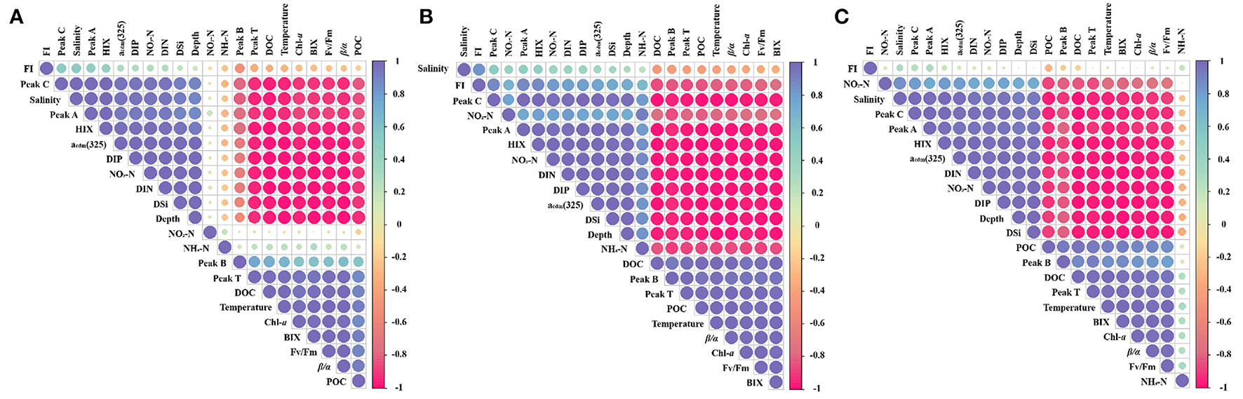 By analyzing relevant hydrological parameters and spectroscopic indices, we found that most parameters were significantly positively or negatively correlated (Figure 7). Indeed, significant correlations were found between acdm(325) and other parameters. Furthermore, acdm(325) was positively correlated with depth, salinity, dissolved inorganic phosphate, dissolved silicate, dissolved inorganic nitrogen, NO3-N, peak A, and peak C, and negatively correlated with temperature, β/α, Chl-a, Fv/Fm, DOC, POC, BIX, and peak T. These correlations suggest that CDOM might be used as a proxy for the marine DOM fraction (Coble, 2007). Moreover, in SA, we clearly saw that the FI, NO2-N, and NH4-N did not correlate significantly with the other parameters (Figure 7A). In contrast, in SB, the correlations between most parameters were significant, except for salinity, which had a weak correlation (Figure 7B). In SC, FI and NH4-N did not correlate significantly with other parameters (Figure 7C). This further illustrates the significant differences in the correlations between hydrological parameters and spectroscopic indices in the three subregions of the EIO. Taken together, the differences in spatial and temporal distributions point to differences in multiple parameters.