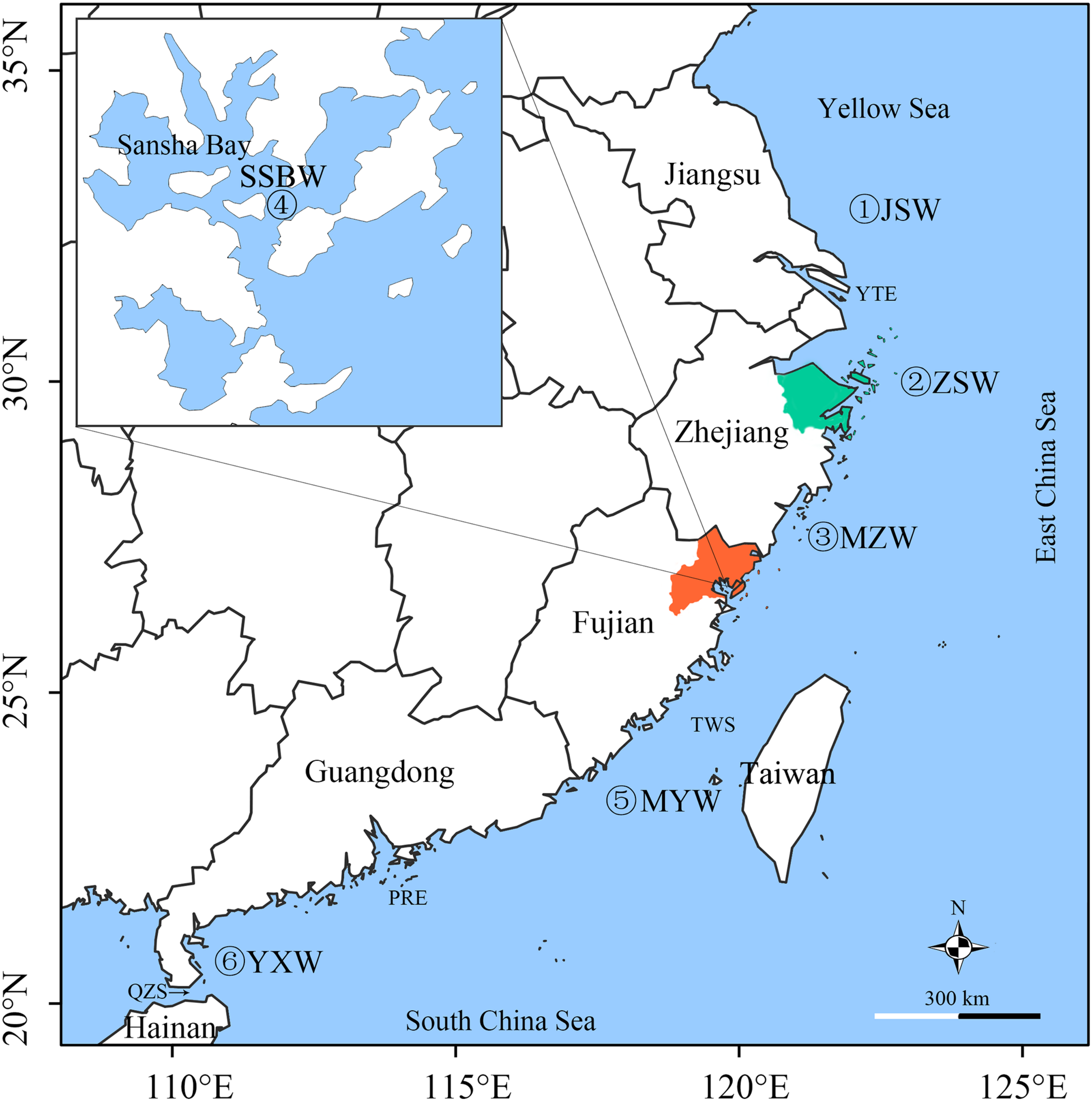 Sampling locations of large yellow croaker populations. JSW, Jiangsu population; ZSW, Zhoushan population; MZW, Minzhe population; SSBW, Sansha Bay population; MYW, Minyue population; and YXW, Yuexi population are wild populations caught in the corresponding seas. The orange area is Ningde City, where most of the FJC fry were produced, and the green areas are Ningbo City and Zhoushan Island, where most of the ZJC fry were produced. The inset map shows Sansha Bay, which is historically the largest spawning and nursery area of large yellow croaker and has been one of the major hatchery release grounds since 2000. TWS, Taiwan Strait; PRE, Pearl River Estuary; QZS, Qiongzhou Strait; YTE, Yangtze River.