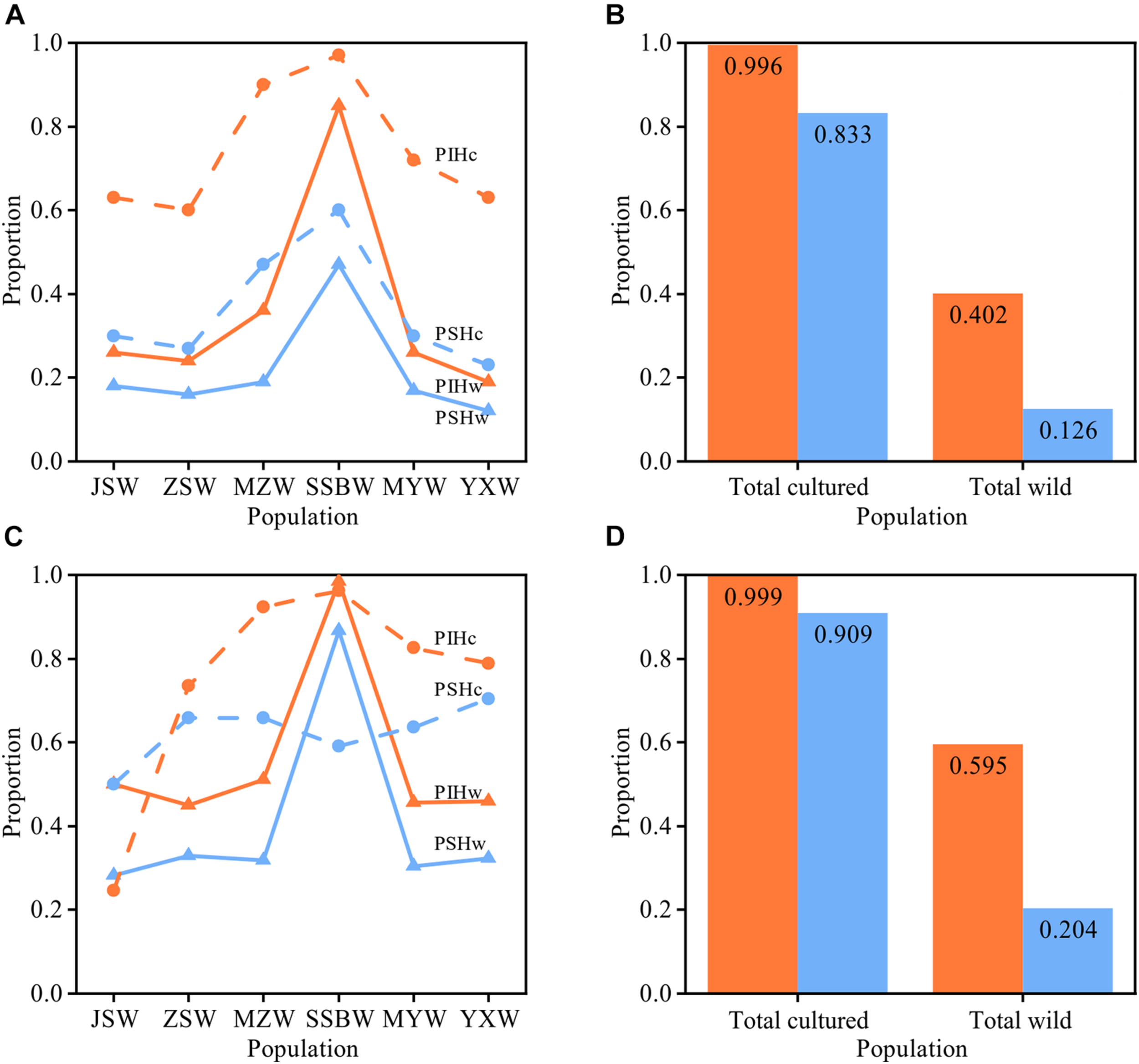 Analysis of shared haplotypes between cultured and wild populations. (A,B) Show the results based on mtDNA, and (C,D) show the results based on the nuDNA. (B,D) Show the PIH and PSH of the total cultured and total wild populations. The proportion of individuals with shared haplotypes (PIH) is shown in orange, and the proportion of shared haplotypes (PSH) is shown in blue. The wild populations are ordered from north to south along the x-axis.