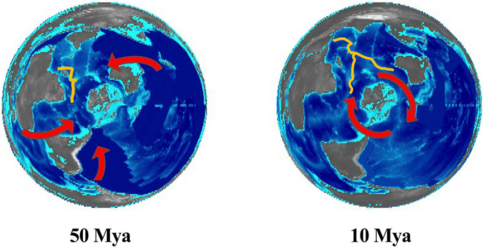 Possible migration routes for vent species into the Indian Ocean. Paleo-digital elevation models from Scotese and Wright (2018) viewed from the South Pole. The Indian spreading ridges are sketched in yellow.
