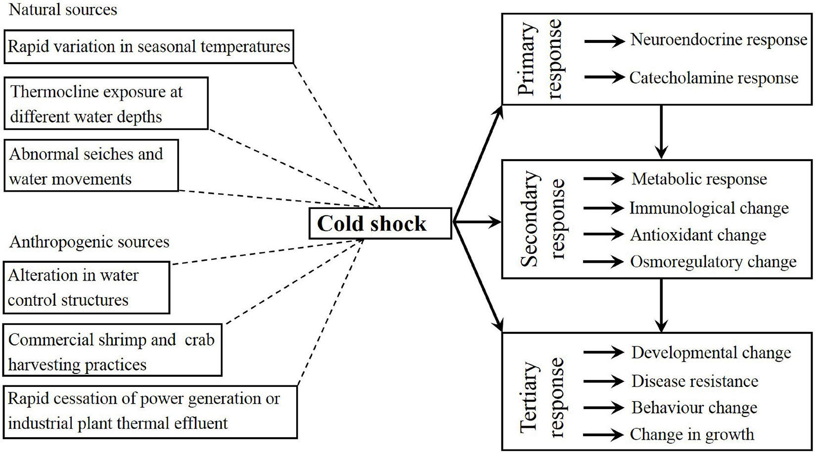 Schematic representation of natural and anthropogenic sources of cold shock and the primary, secondary and tertiary responses to cold shock.