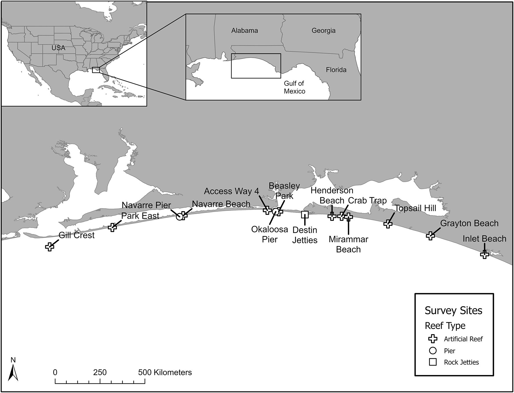 Northeastern Gulf of Mexico survey sites from Escambia County to South Walton County, Florida.