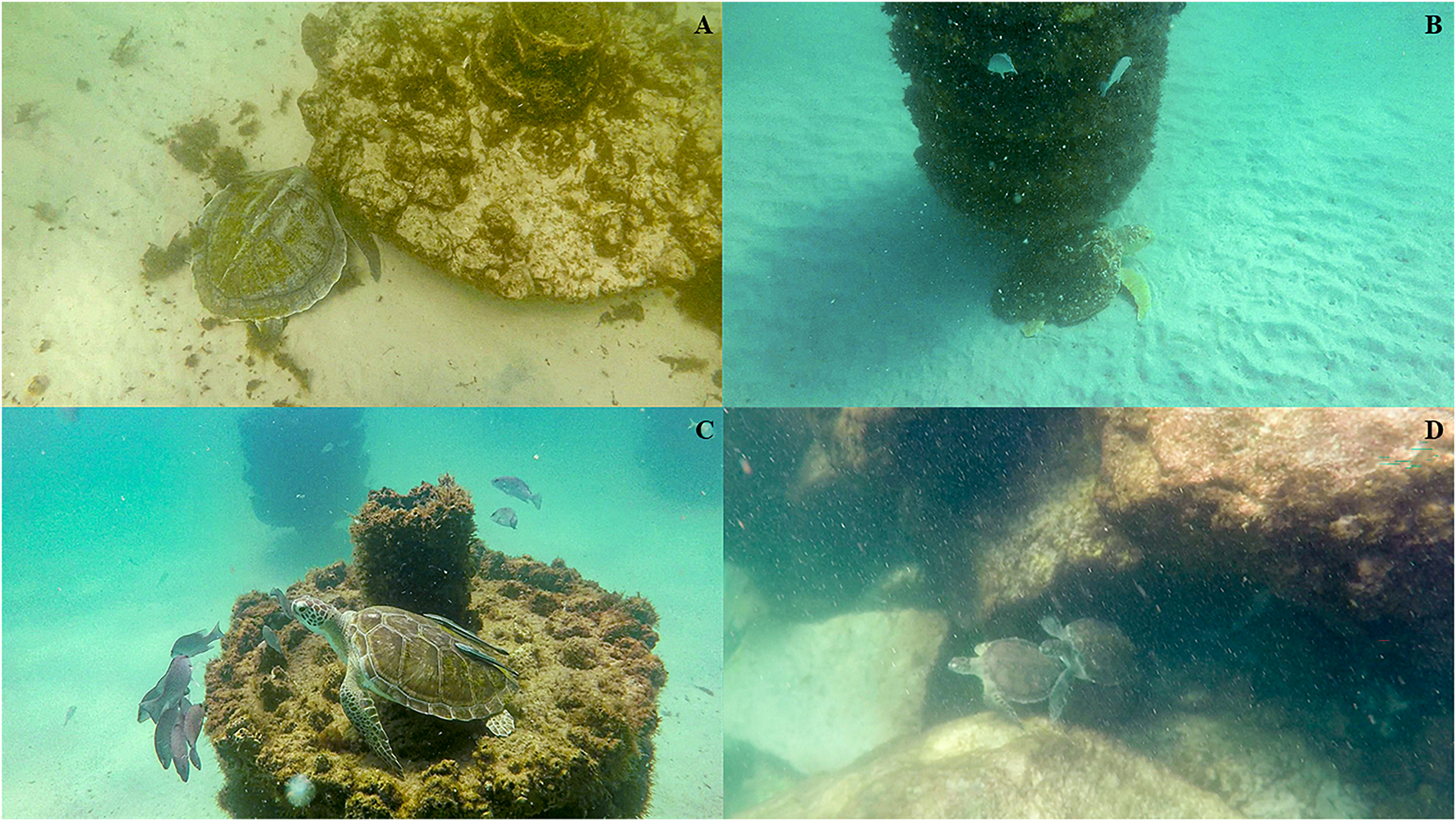 All species of sea turtles using artificial habitats for resting and protection in the northeastern Gulf of Mexico. (A) Kemp’s ridley (Lepidochelys kempii), (B) Loggerhead (Caretta caretta), (C) green (Chelonia mydas), observed sitting on top of reef module, and (D) two juvenile green turtles observed resting and swimming together at the Destin East Pass Jetties.