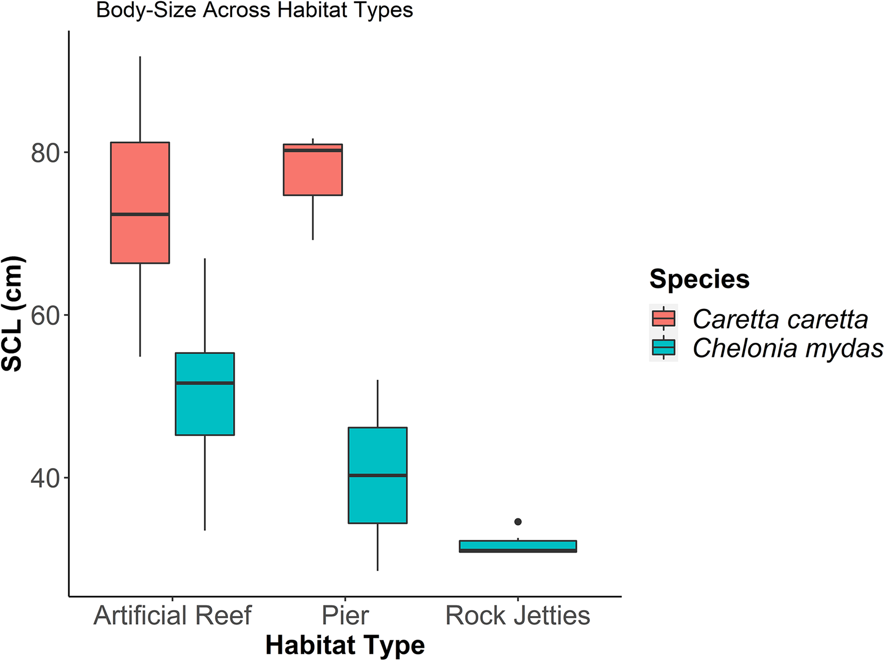 Sea turtlestraight carapace length (SCL) in relation to habitat type and species.