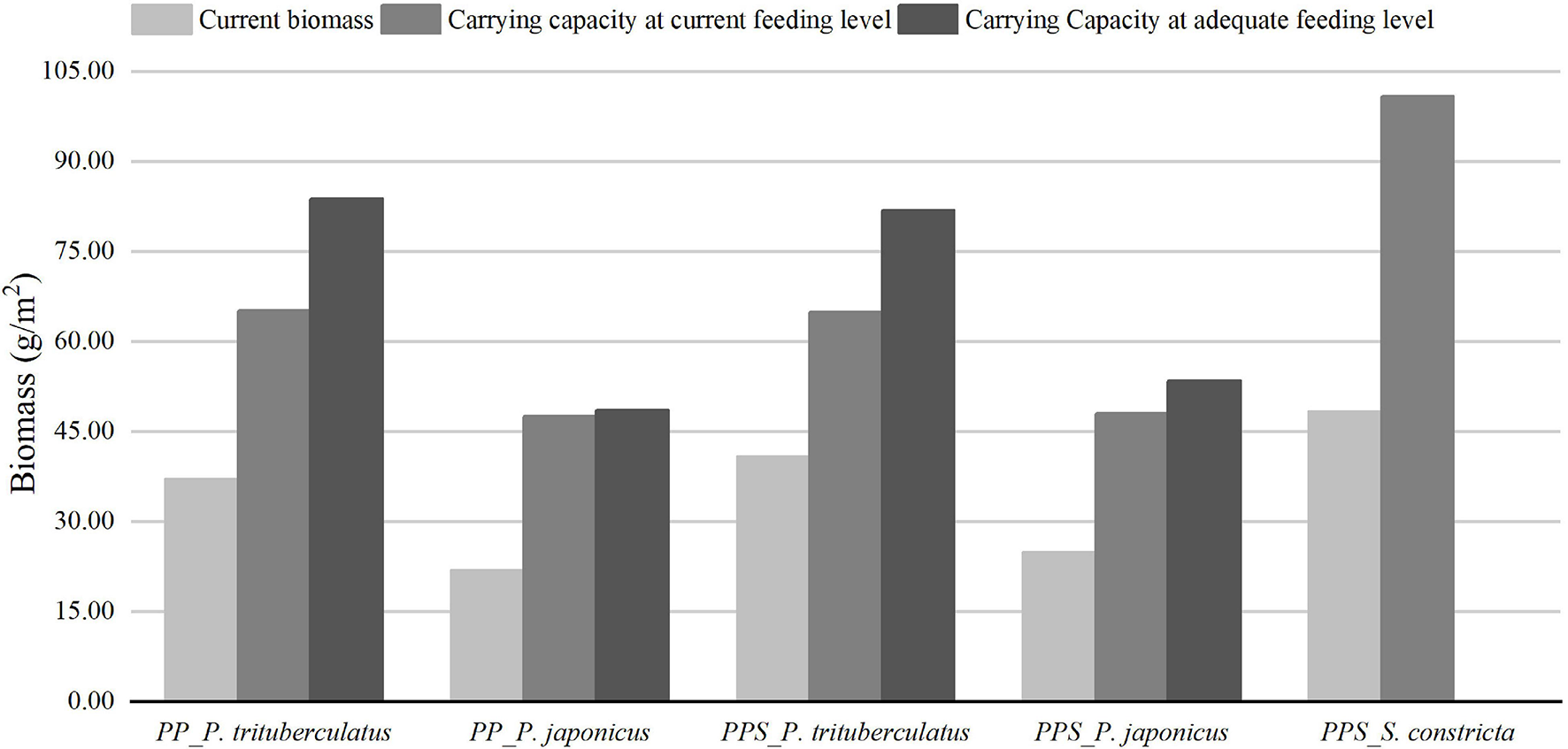 Portunus trituberculatus is the first of the three major crab aquaculture species in China, with production reaching 113,810 tons in 2019 (China Fishery Statistics Yearbook, 2020). In order to improve various ecological and economic benefits of P. trituberculatus aquaculture pond, crabs are usually polyculture with kuruma shrimp Penaeus japonicus, Pacific white shrimp Litopenaeus Vannamei, razor clams Sinonovacula constricta, and Manila clams Ruditapes philippinarum (Wang, 2011). Therefore, we constructed two Ecopath models of integrated pond aquaculture ecosystems of P. trituberculatus–Penaeus japonicus (PP) and P. trituberculatus–P. japonicus–S. constricta (PPS) using data from a field survey and the literature. We analyzed and assessed energy flows, ecosystem properties, and carrying capacities of the two ecosystems. This study is important for the optimization of the pond culture pattern and the improvement of culture management techniques. It also provides a reference for carrying capacity assessments of integrated aquaculture systems.