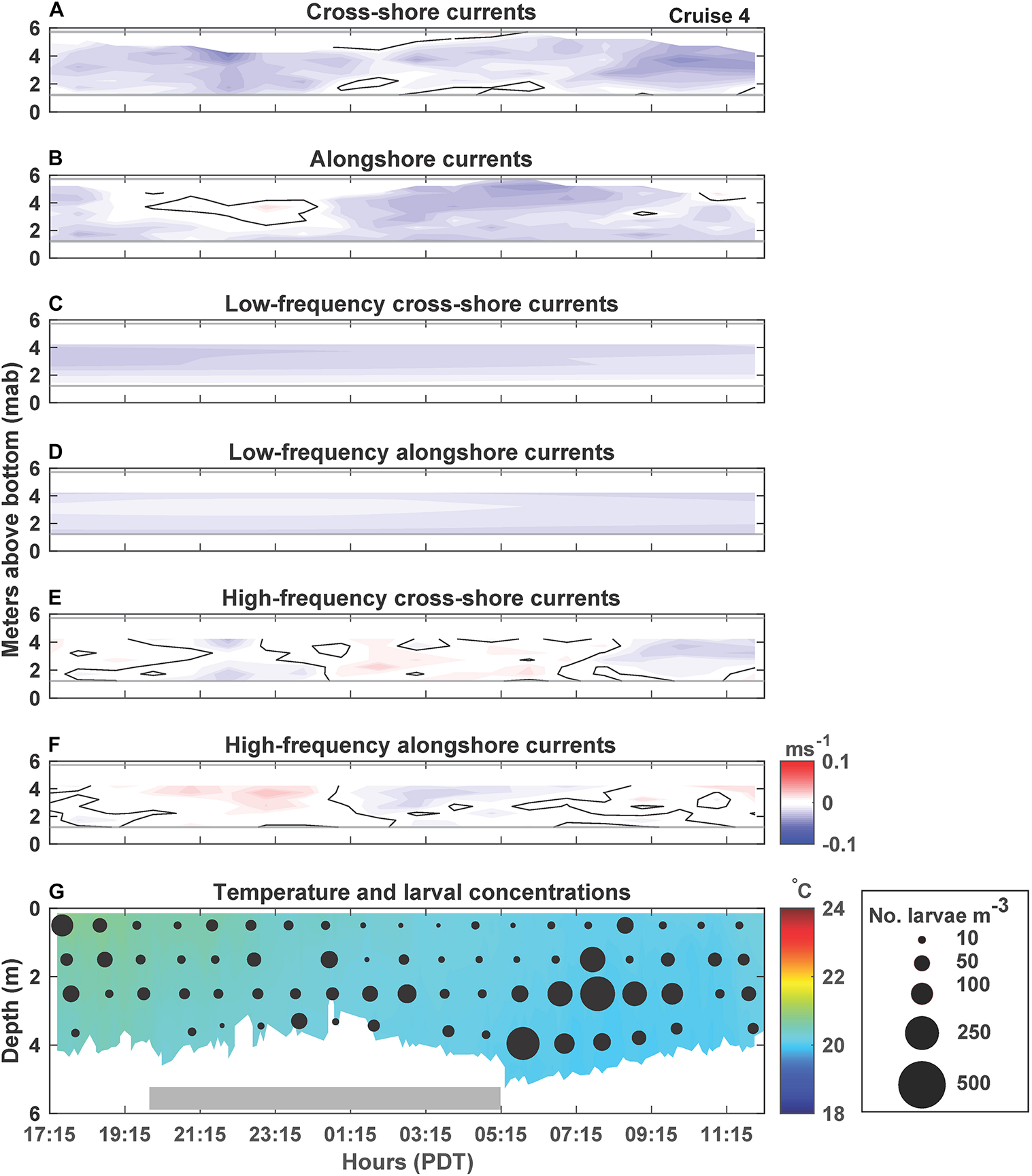 C. fissus cyprid concentrations also varied by cruise, with the lowest mean concentrations during Cruises 1, 2, and 4, and one order of magnitude greater concentrations during Cruises 3 and 5 (Table 1). While, cyprid distributions were also variable vertically and on hourly time scales, concentrations did not appear to fluctuate consistently with the currents or temperature (Figures 2–6). For example, during Cruise 1, cyprid concentrations were highest in northward flowing waters when examining the unfiltered and high-frequency currents (e.g., 17:15-19:15 PDT and 0:15-2:15 PDT, Figures 2B,F,G), but this pattern was not evident during Cruise 2 despite the strong alongshore current reversals in the unfiltered and high-frequency records (Figures 3B,F,G). In contrast, at the beginning of Cruise 3 (before 16:00 PDT), cyprid concentrations were highest in cooler temperature mid-depth to bottom waters when high-frequency currents were to the north and onshore (Figures 4E,F,G), but distributions shallowed at the onset of warmer surface waters ∼18:00 PDT near the time of an alongshore and cross-shore current reversal, but eventually resumed a deeper distribution near the end of the cruise when waters were cooler (Figure 4G). Likewise, during Cruise 4, there was an increase in cyprid concentrations after 5:15 PDT, as temperatures gradually cooled during the cruise (Figure 5G). Finally, during Cruise 5, cyprid concentrations increased near the surface ∼ 21:00-23:00 PDT, corresponding to an alongshore current reversal in the unfiltered and high-frequency currents, when flows shifted from southward to northward (Figures 6B,F,G). Cruise 5 temperatures were relatively warm, but experienced slight bottom cooling ∼ 7:00 PDT when we observed increasing cyprid concentrations at depth (Figure 6G). Over all of the cruises, one consistent pattern was that cyprid concentrations were typically greatest in the mid-depth (2–3 m) depth bins (Figure 7).