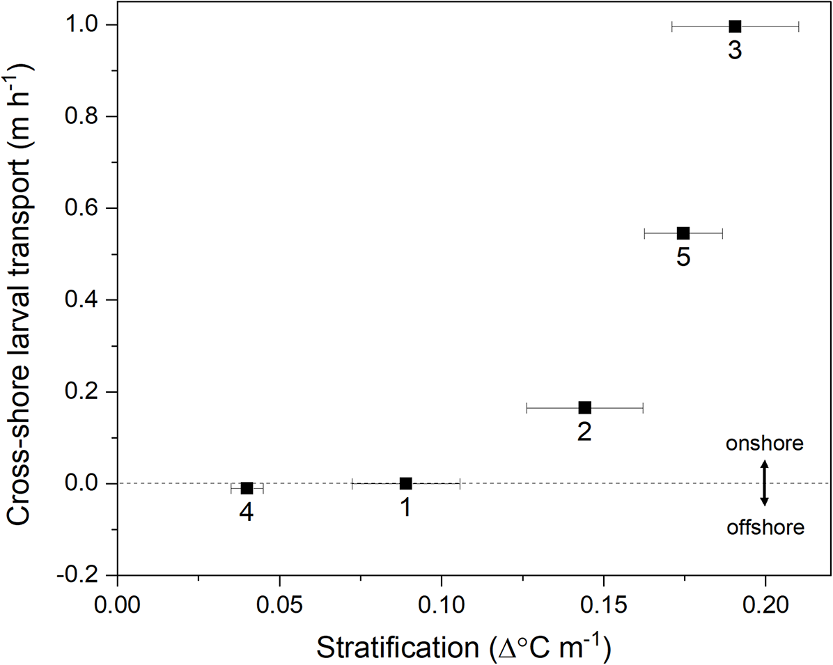 Relationship between mean (±SE) thermal stratification and estimated C. fissus cross-shore larval transport for each cruise (numbers 1–5). Positive values represent onshore (eastward) larval transport.
