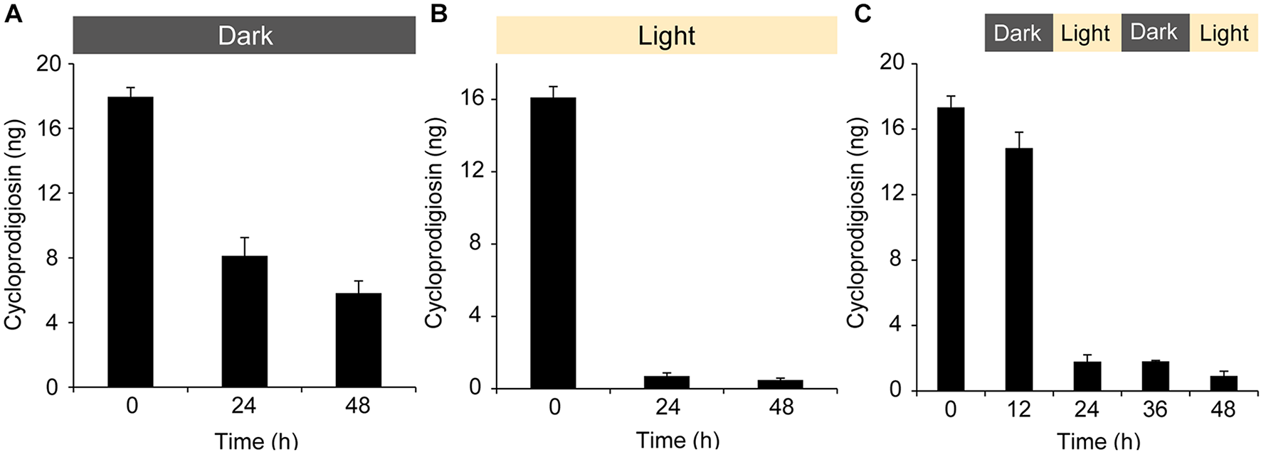 The influence of light and its absence on the isolated pigment cycloprodigiosin (I). 1 μg of (I) was added to a 5 mL well plate, the solvent MeOH evaporated and 5 mL FASW added on top of the isolated pigment. The concentration changes of (I) over 0, 12, 24, 36, and 48 h at (A) complete darkness, (B) white light and (C) alternating 12 h dark/light cycles were monitored after discarding the water and re-extracting the well plate with 200 μL MeOH. (5 μL injected to the UPLC-MS).