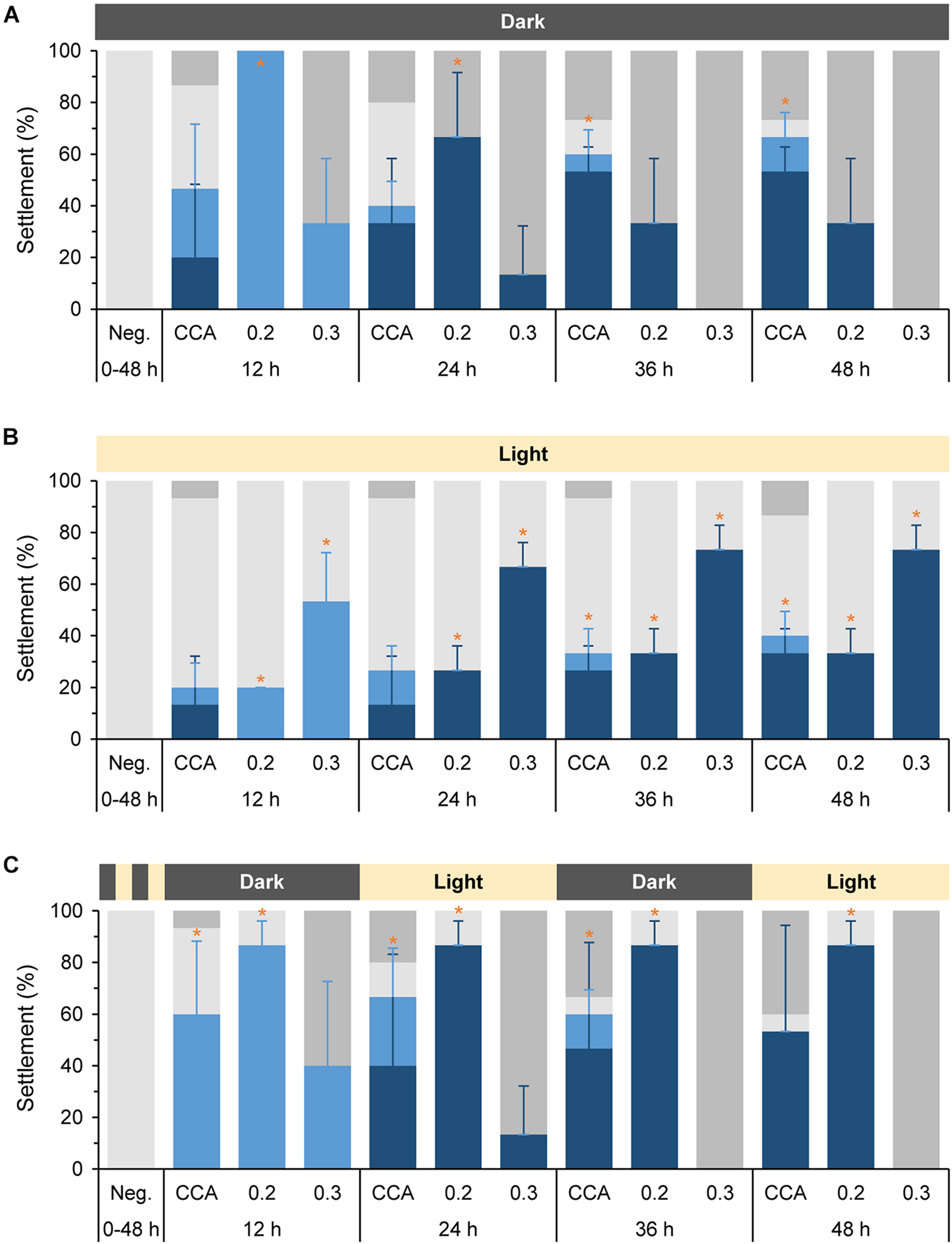 Settlement behavior of Leptastrea purpurea larvae in response to different concentrations of cycloprodigiosin (I) and three varying light regimes. Coral larvae were exposed to (I) levels of 0.2 μg mL–1 and 0.3 μg mL–1 for 12, 24, 36, and 48 h in complete darkness (A), constant white light (B) and 12 h alternating periods of dark and light phases starting with complete darkness (C). Percentages of swimming larvae are displayed in light gray, attachment in light blue, settlement (attachment and metamorphosis) in dark blue, and dead larvae in dark gray colors. Evaporated MeOH and 5 mL of FASW served as negative control (Neg). Small pieces of live CCA emerged in 5 mL of FASW were used as positive control. Error bars represent standard deviations of settlement and attachment. Asterisks (*) represent significant settlement responses (p < 0.05, n = 3).