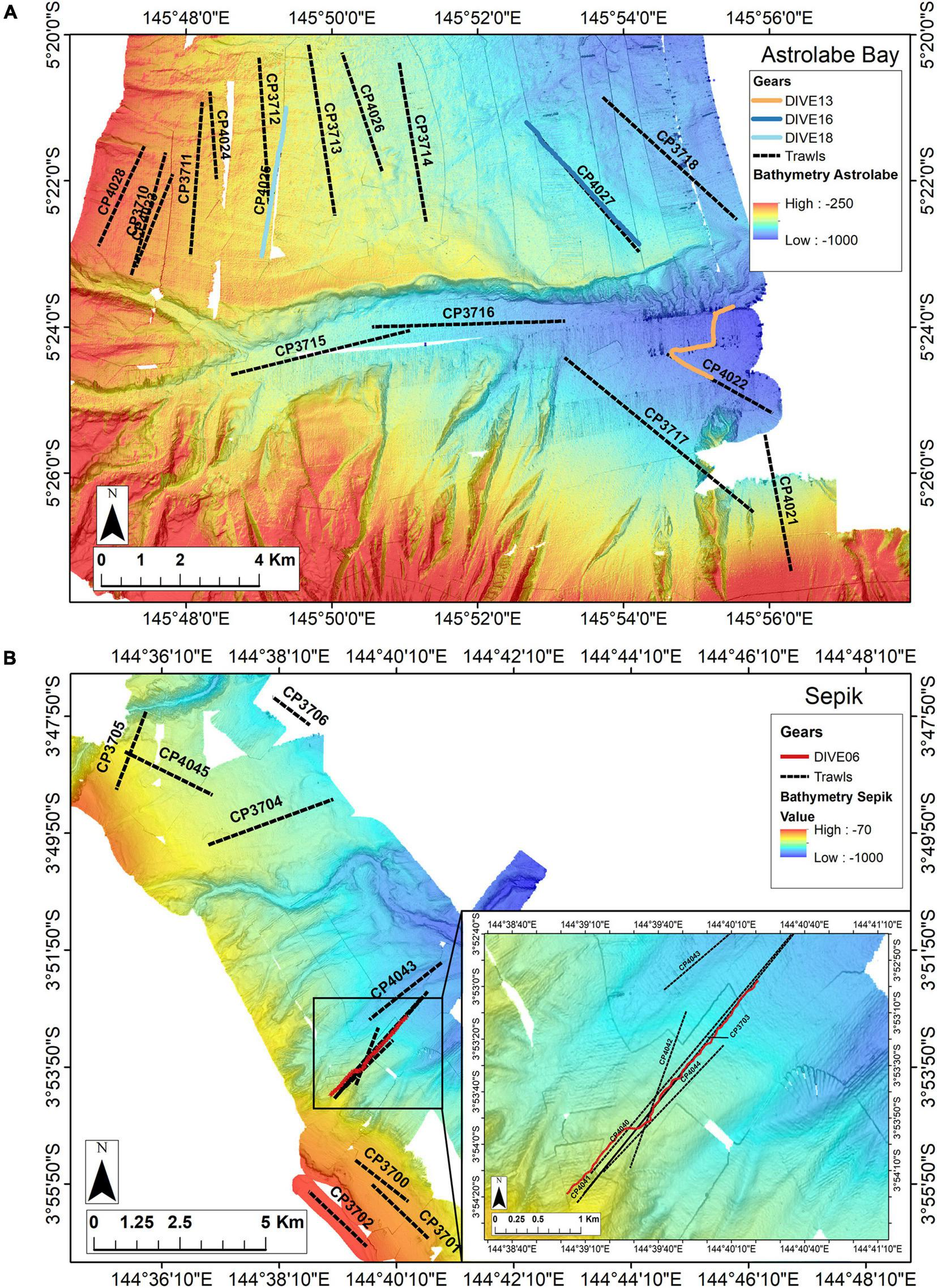 Locationof the camera transects and dredge/trawl transects operations (dive, sampling along dive and in the surrounding area): Panel (A) in the Astrolabe Bay and panel (B) in the Sepik River area (Broken Water Bay). Colored lines represent camera transects, black dotted lines represent dredging (DW) and trawling (CP) operations.