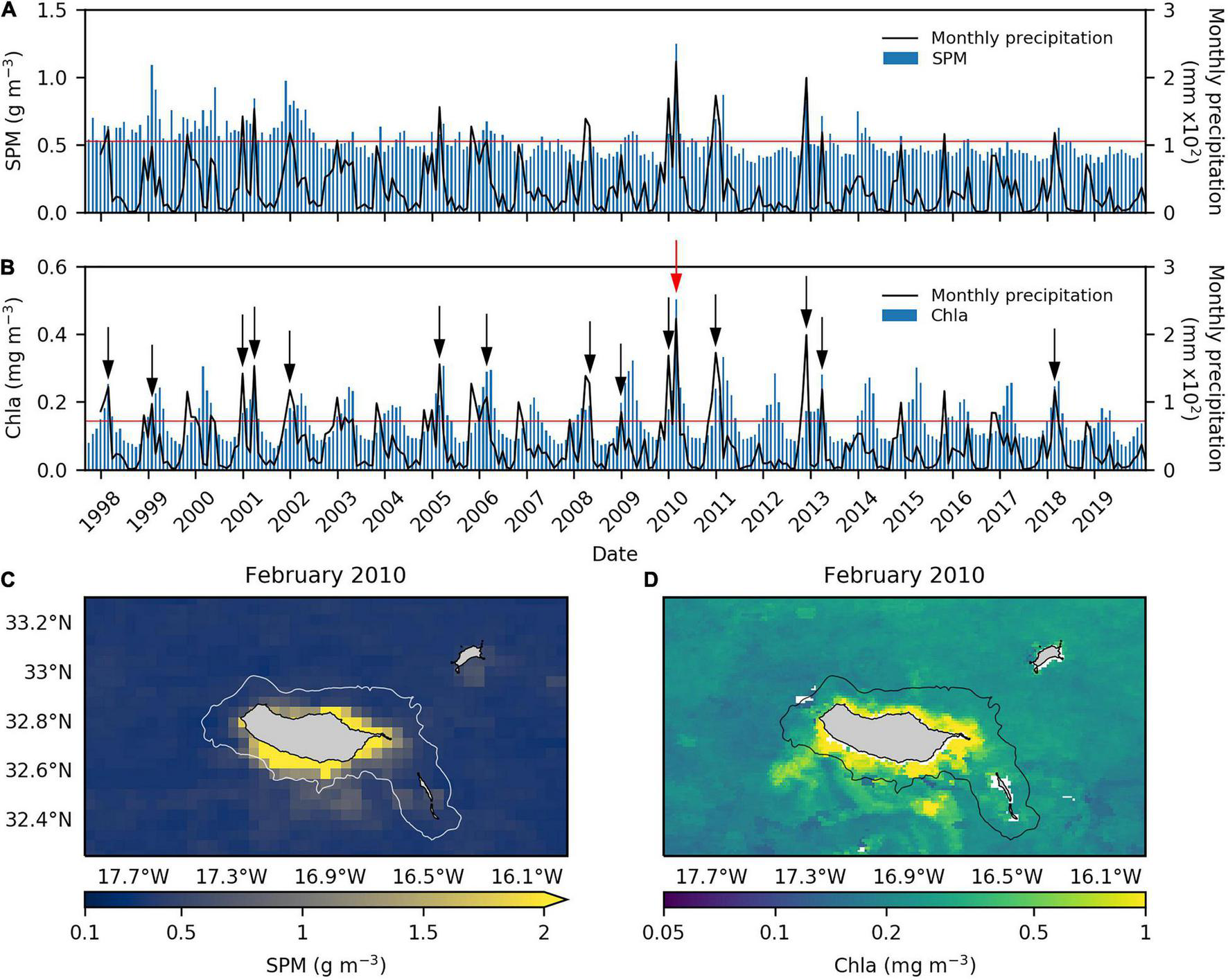Monthly variability of (A) non-algal Suspended Particulate Matter (SPM; g m–3) and (B) Chlorophyll-a (Chla; mg m–3) concentrations at the inner shelf area (calculated with values within the -2000 m isobath, represented by the white and black line in C,D, respectively) between September 1997 and December 2019 based on satellite data along with monthly accumulated precipitation recorded at 9 meteorological stations distributed over the island (black line). The red line represents the mean, and the black arrows in (B) indicate anomalous Chla concentrations associated with runoff episodes. Satellite images of the regional area of Madeira Archipelago representing the monthly average of (C) SPM and (D) Chla concentrations for the specific episode of February 2010, when the maximum of concentrations occurred (red arrow in B).