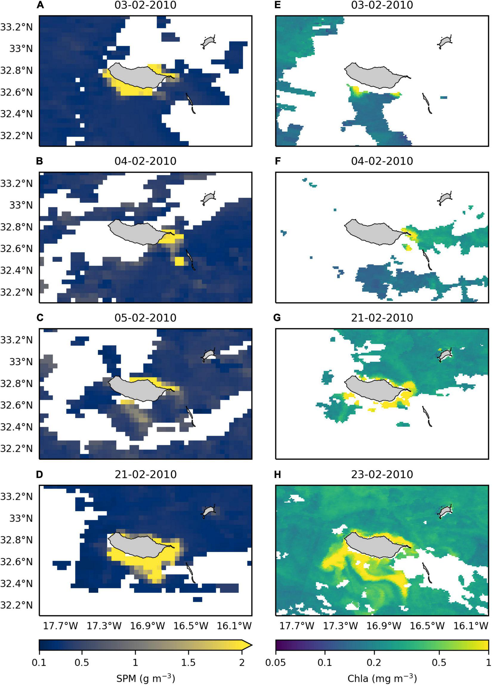 Satellite images of the regional area of Madeira Archipelago. Daily averages of (A–D) non-algal Suspended Particulate Matter (SPM; g m–3) and (E–H) Chlorophyll-a (Chla; mg m–3) concentrations for specific days of February 2010.