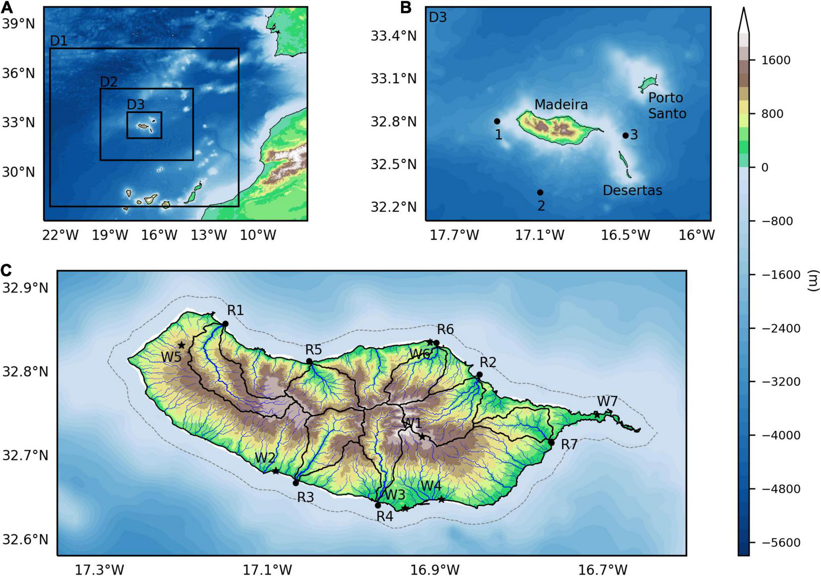 Map of the study area showing the topography and bathymetry retrieved from the Shuttle Radar Topography Mission (SRTM). (A) Representation of the three nested COAWST model domains (black boxes D1, D2, and D3, corresponding to 9, 3, and 1 km resolution, respectively). (B) Model domain D3 encompassing the regional area of Madeira Archipelago (Selvagens are not shown), where numbers correspond to locations used for model validation. (C) Madeira Island showing: (i) the drainage network (blue lines), with identification of the main river outlets (R1—Ribeira da Janela, R2—Ribeira de São Roque do Faial, R3—Ribeira Brava, R4—Ribeira dos Socorridos, R5—Ribeira de São Vicente, R6—Ribeira de São Jorge, R7—Ribeira de Machico; black circles) and its drainage basins (delimited by black lines); (ii) the location of the meteorological stations deployed by IPMA (Portuguese Institute for Sea and Atmosphere; black stars W1–W7) used for model validation; (iii) the location where vertical transects parallel to the north and south coast were performed (gray dashed lines).