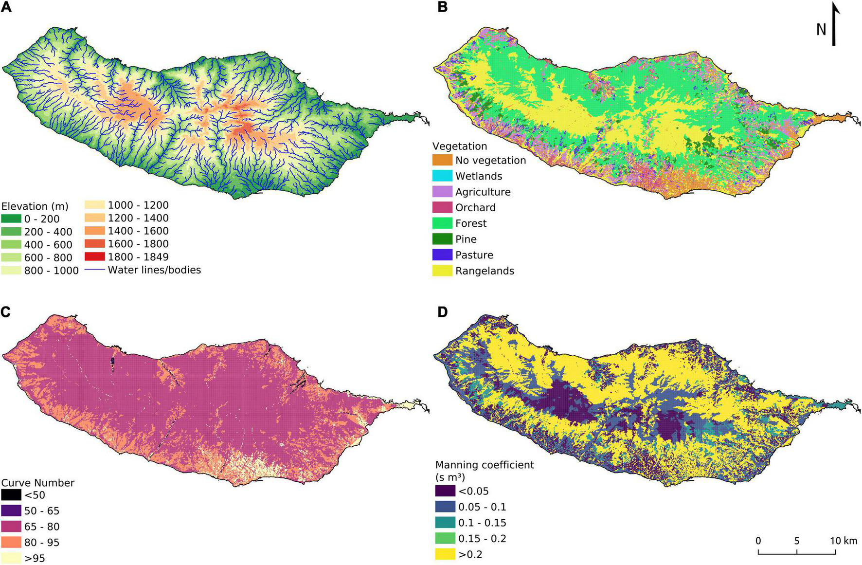 Maps used in the hydrological simulations (MOHID-Land): (A) Digital Terrain Model with drainage network; (B) soil use; (C) curve number (CN-AMCII); (D) Manning coefficient.